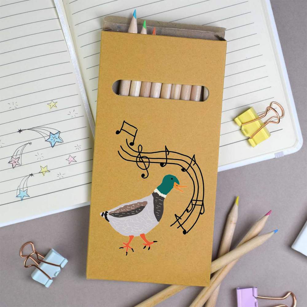 Our sets of wooden colouring pencils make an ideal gift (personal or corporate) and are really handy when you need to do some colouring in. There are 12 assorted full size colouring pencils per box (colours may vary) and the storage box they come in features one of our unique designs.