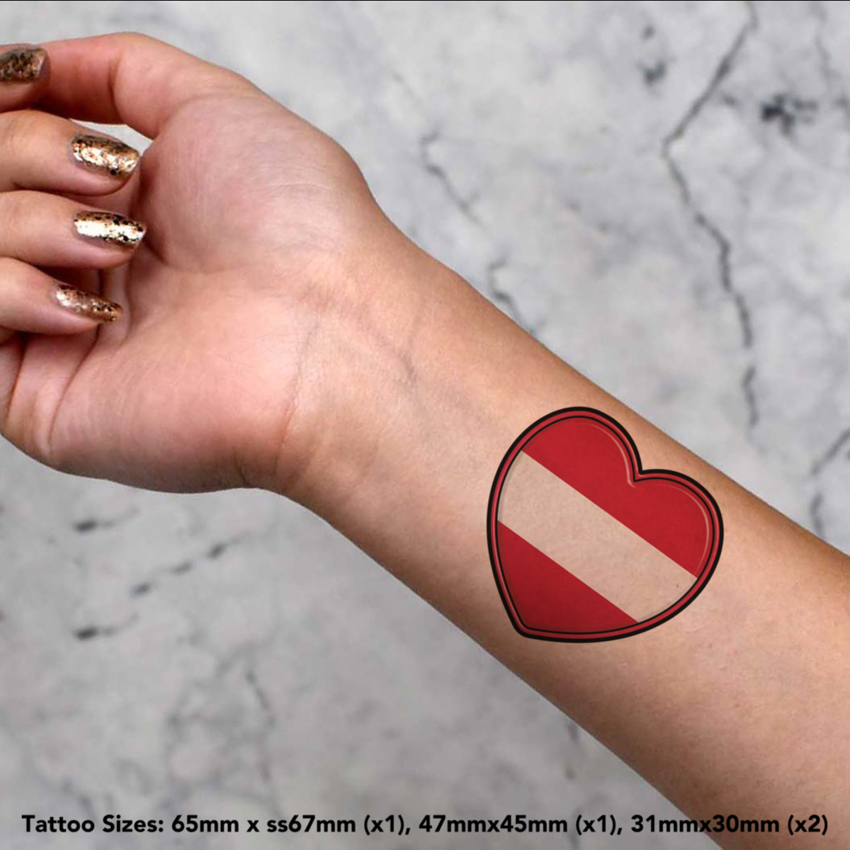 4 x 'Austria Flag Heart' Temporary Tattoos - Water Resistant, Skin-Safe, Non-Toxic Transfers, Mixed Sizes (TO00062336)