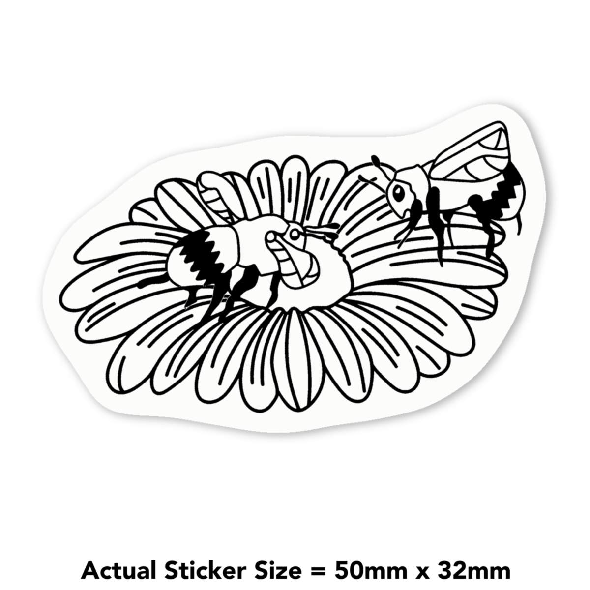 'A daisy blooms under the watch of two busy bees, capturing the harmony of nature in simple lines.'