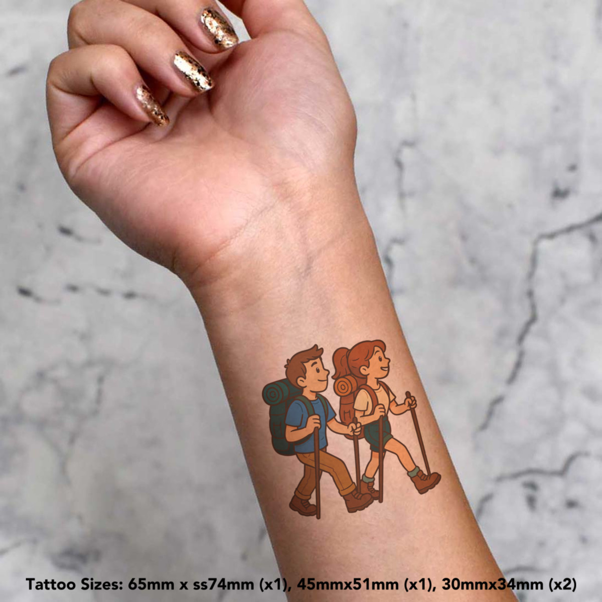 4 x 'Hiking Couple' Temporary Tattoos - Water Resistant, Skin-Safe, Non-Toxic Transfers, Mixed Sizes (TO00091490)