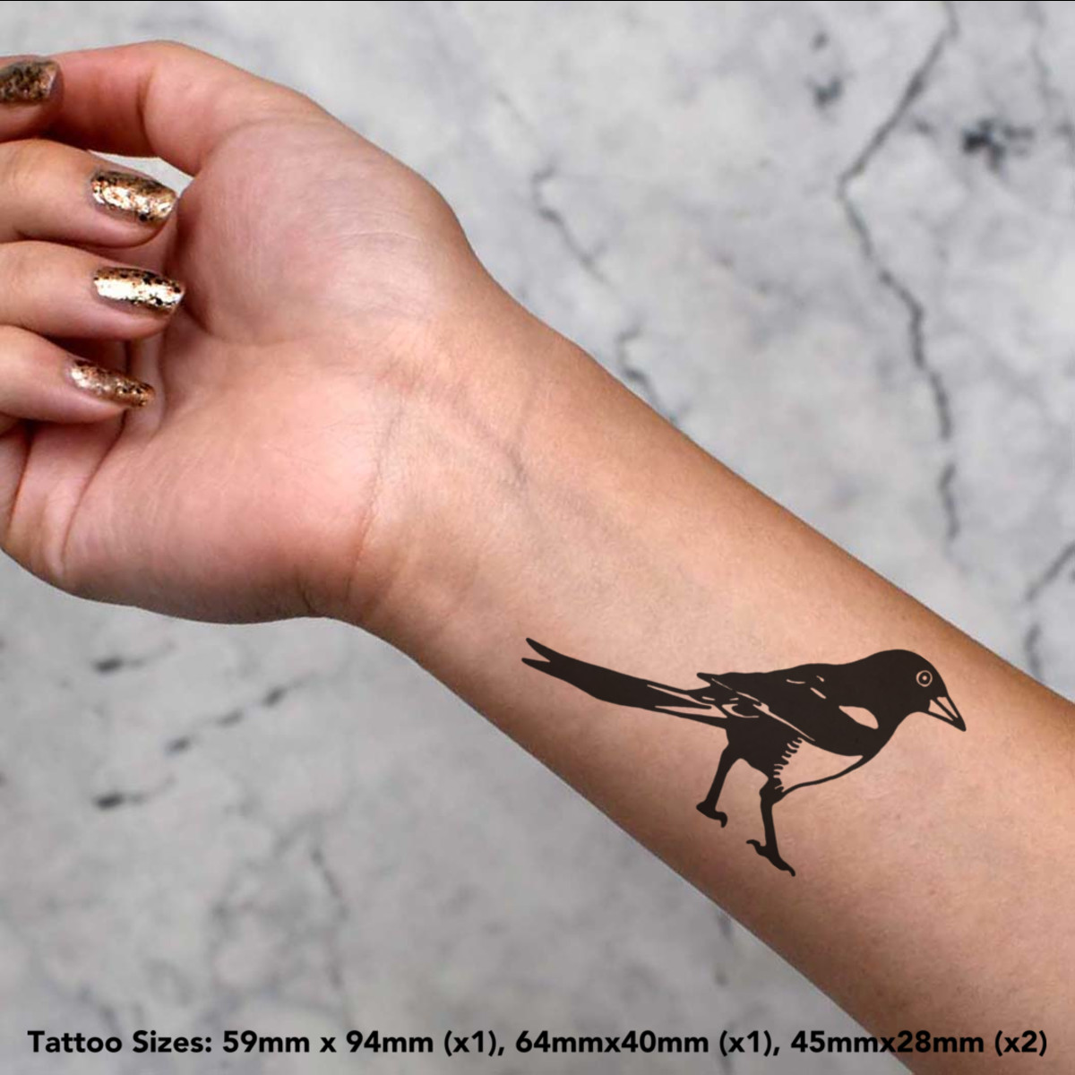4 x 'Magpie' Temporary Tattoos - Water Resistant, Skin-Safe, Non-Toxic Transfers, Mixed Sizes (TO00000037)
