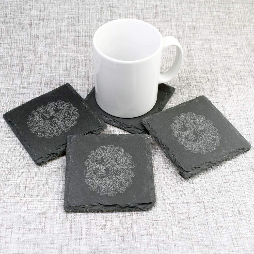 These high quality slate coasters come in a pack of 4 and feature a unique design carefully engraved onto each one. The coaster itself is made from natural slate and is not only stylish but also great for protecting your surfaces from hot and cold drinks. Highly durable with a high grade finish, each coaster also has a set of four padded, anti-slip feet on the underside. Each coaster is approximately 10cm x 10cm square and 1cm thick, as slate is a natural material be aware the thickness and edges may vary slightly from coaster to coaster.