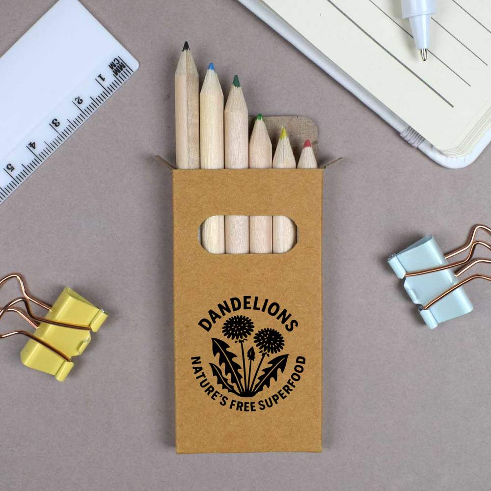 These sets of six mini colouring pencils are ideal for travel or to slip in a bag for those emergency colouring in scenarios that we all face. There are six half size colouring pencils in each box (colours may vary) and the storage box they come in features one of our unique designs.