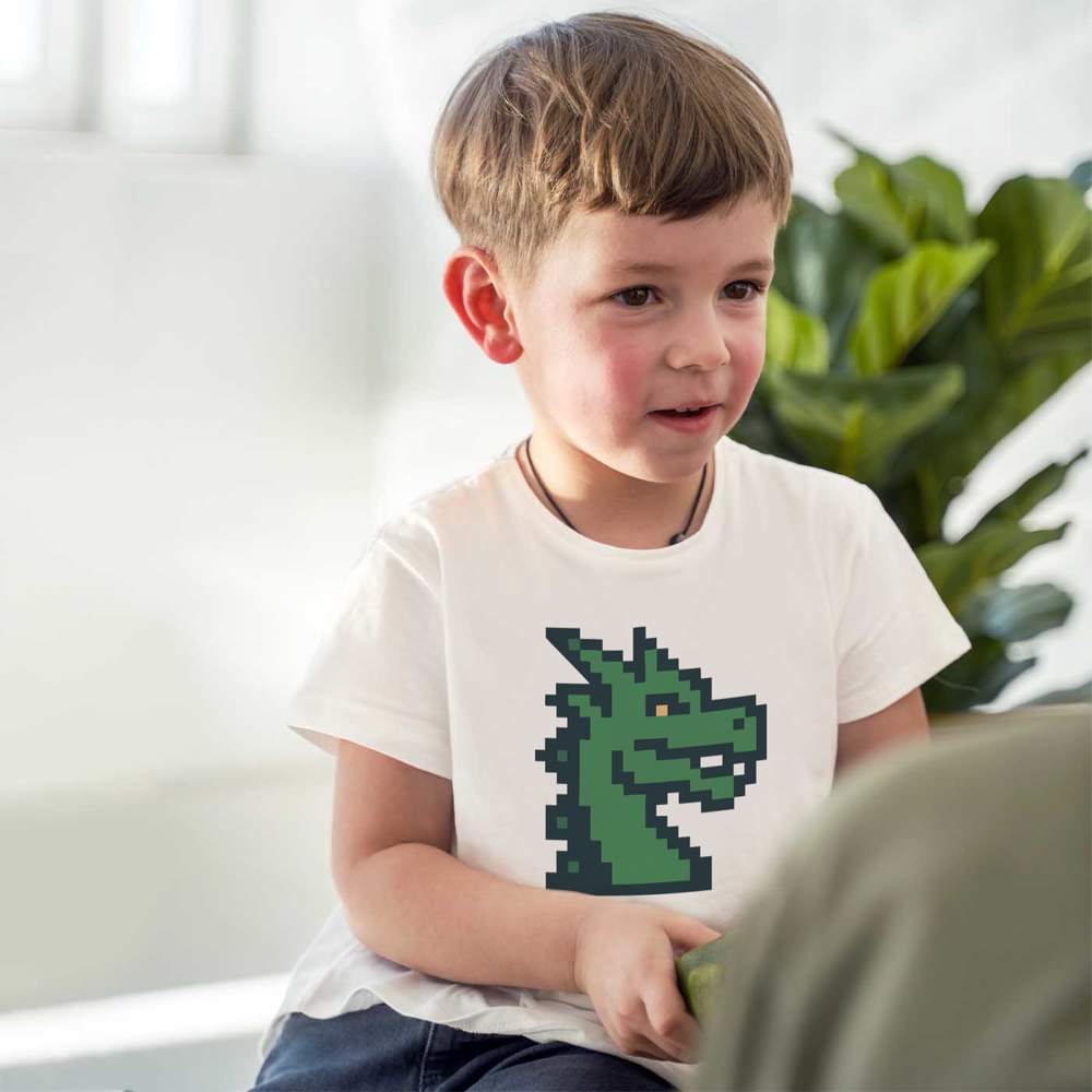 'A cool 8-bit design of a dragon head, perfect for fans of classic video games, fantasy themes, and pixel art'