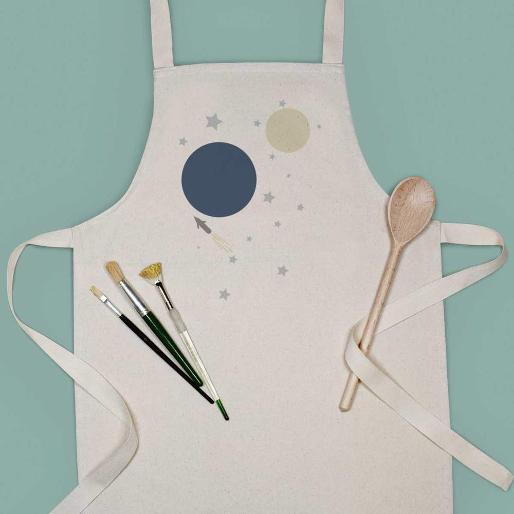 This apron can be used in the kitchen or for arts and crafts; perfect for little ones who love baking, painting or messy play. Our kid’s aprons are made from 100% cotton canvas and are printed on the front with a unique design. Each apron has a neck tie with hook and loop fastening and 60cm waist ties.