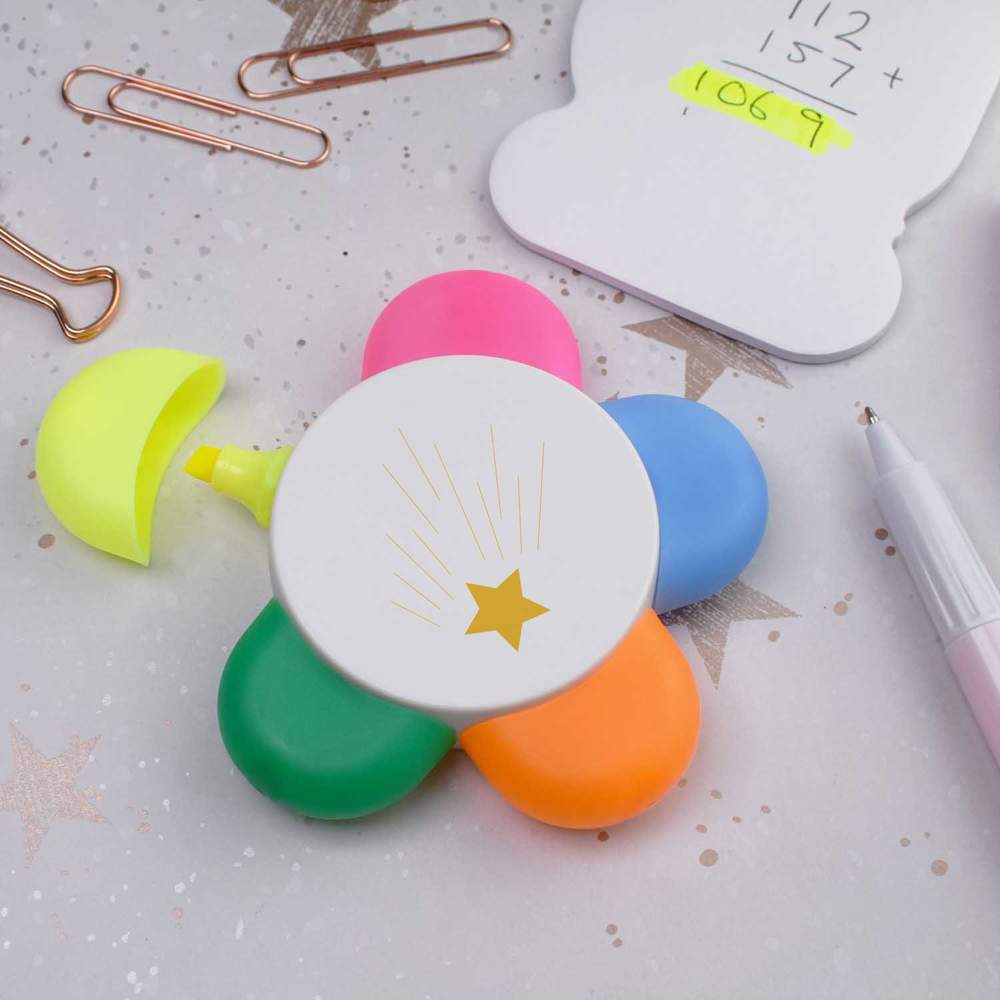 This fun flower shaped highlighter combines five colours in one pen; pink, yellow, green, orange and blue. Each colour has a matching secure cap and a chisel tip for smooth underlining, highlighting and colouring. Printed on one side with a unique design this handy tool makes a great gift for students, teachers and children.