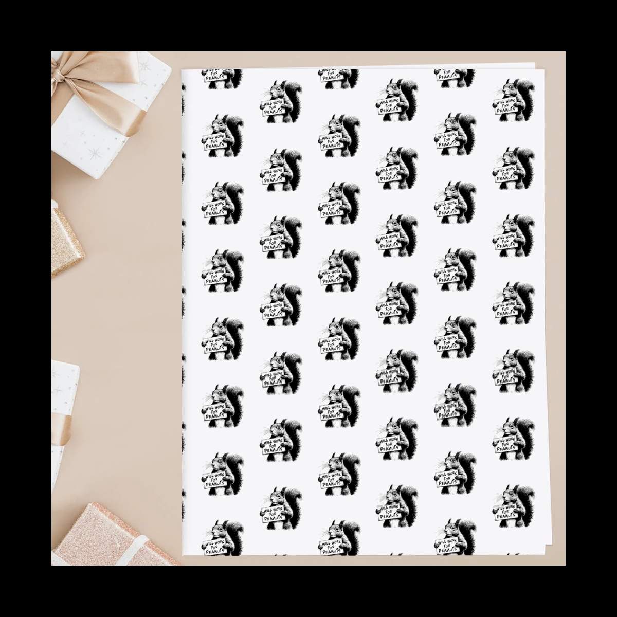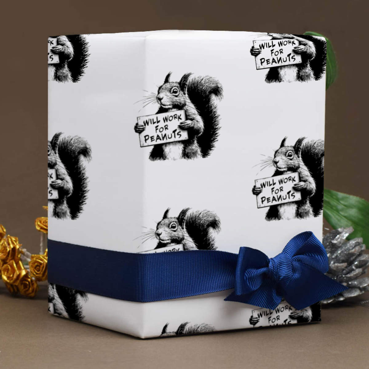 'Illustration of a Funny Squirrel holding a Card Declaring he will work for Peanuts'