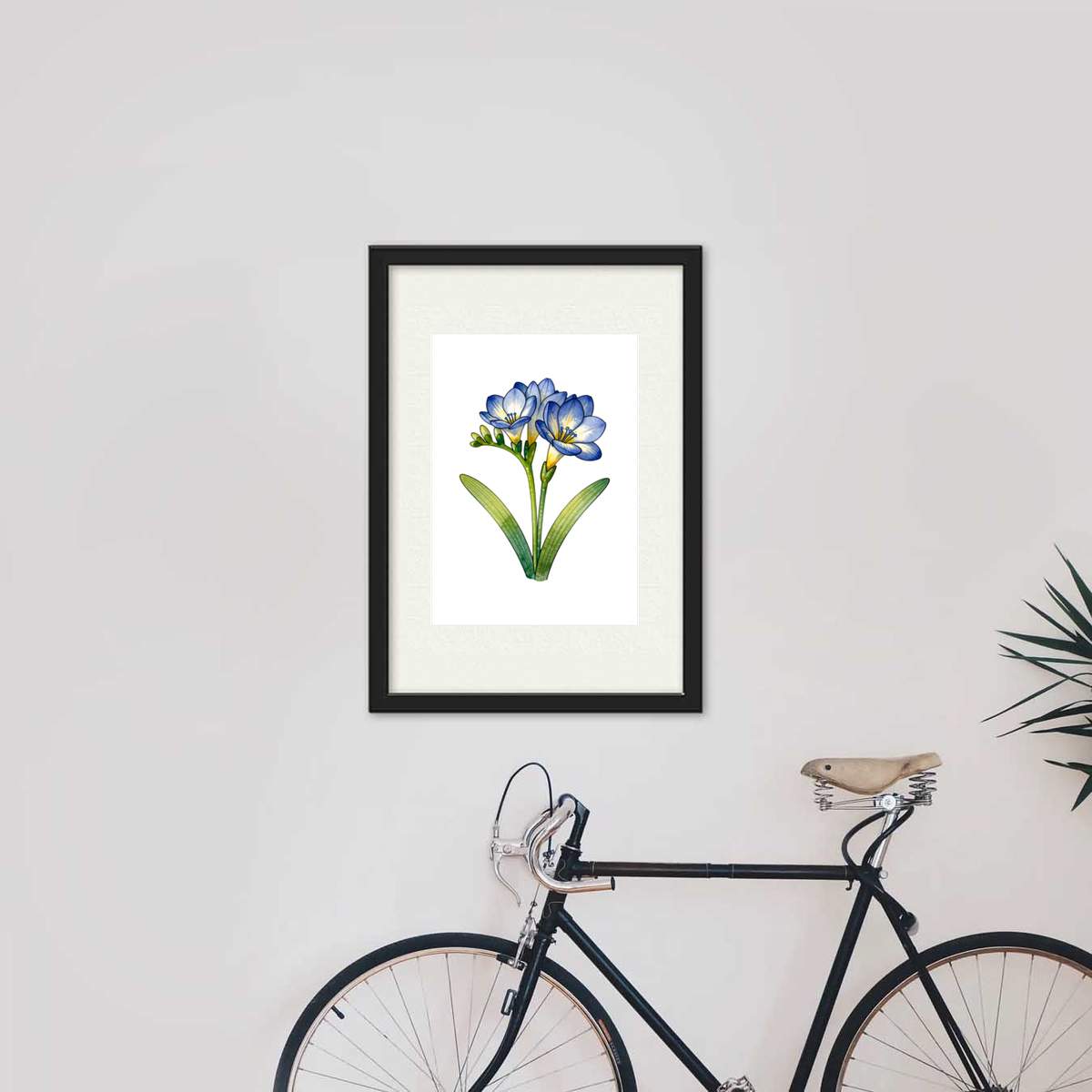 'A design featuring a blue freesia flower with green leaves.'
