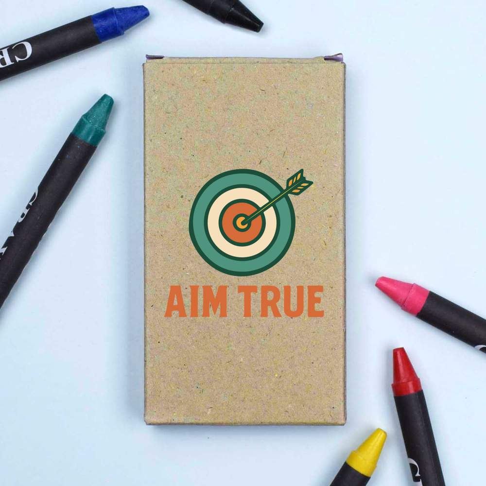 'A target with an arrow hitting the bullseye and the slogan 'Aim True' in orange text'