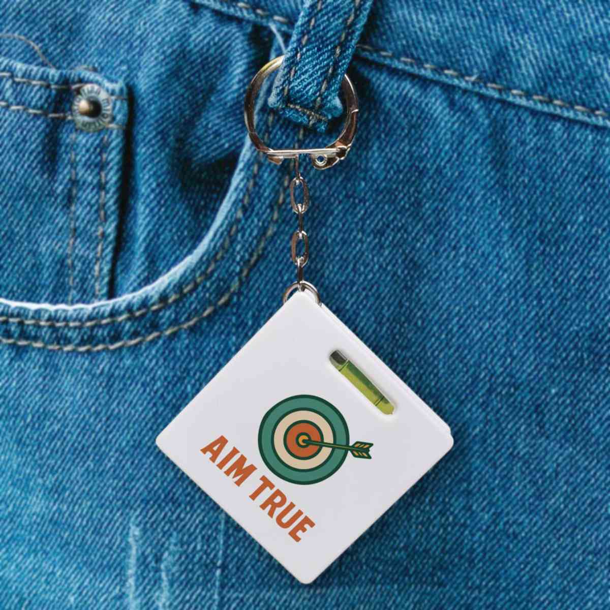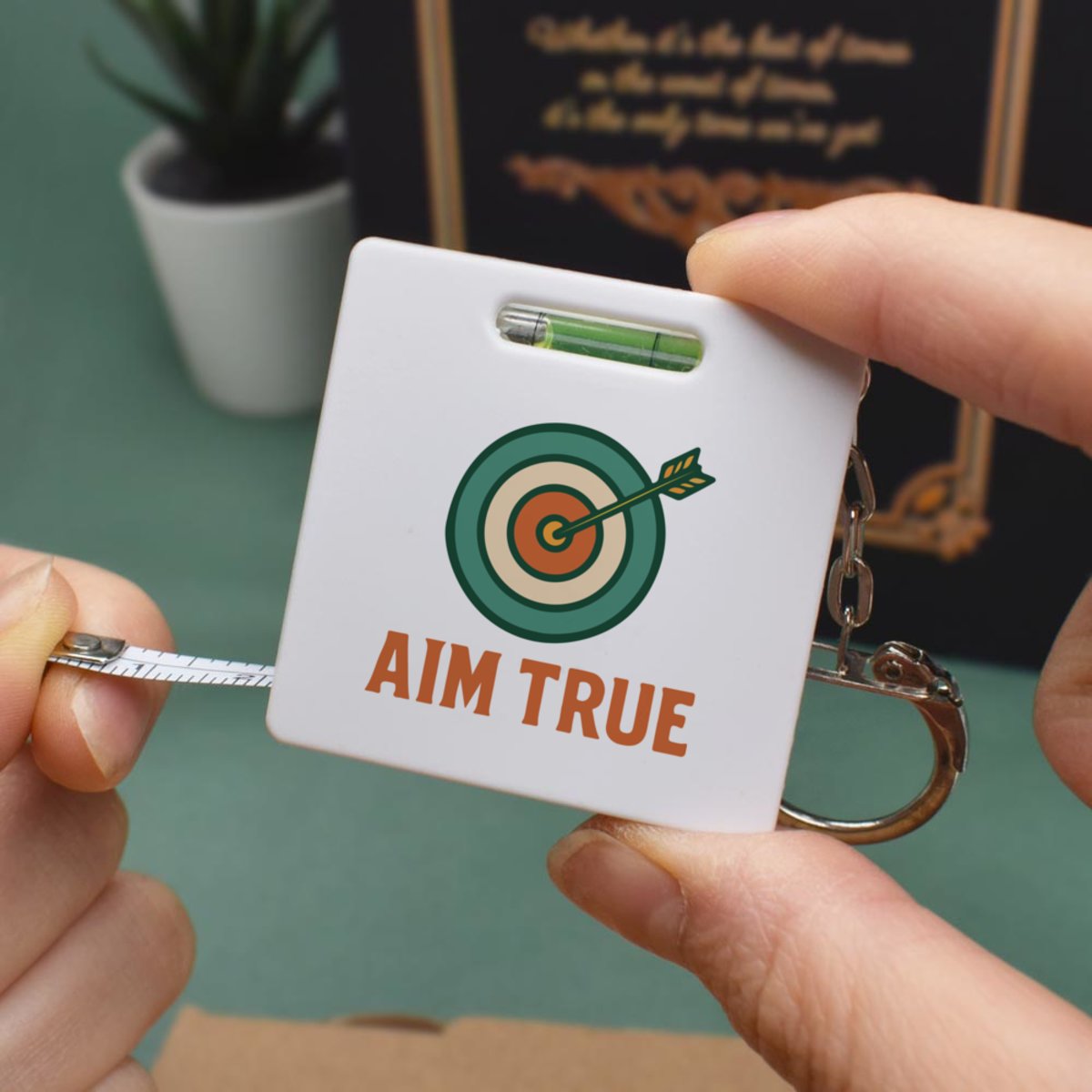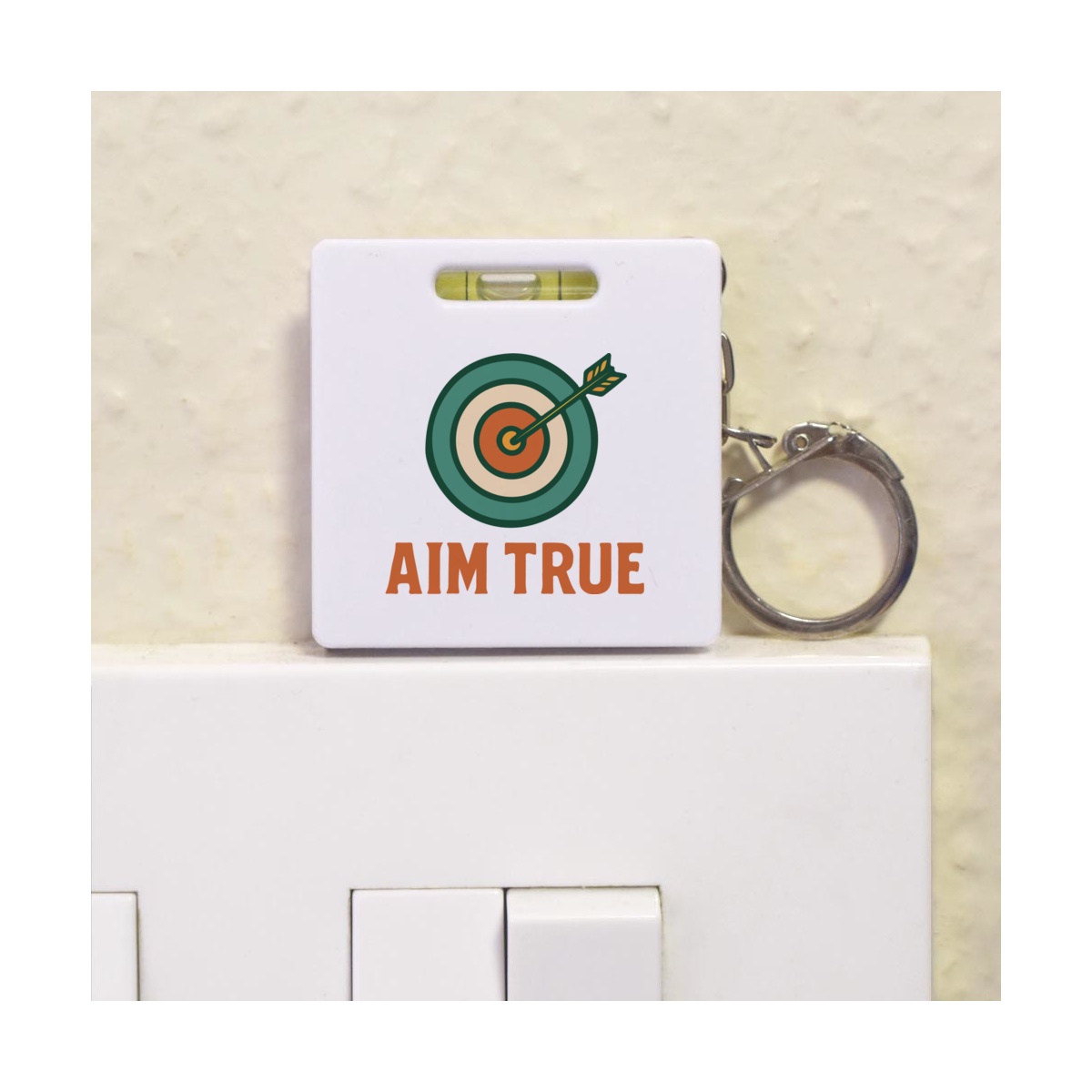 'A target with an arrow hitting the bullseye and the slogan 'Aim True' in orange text'