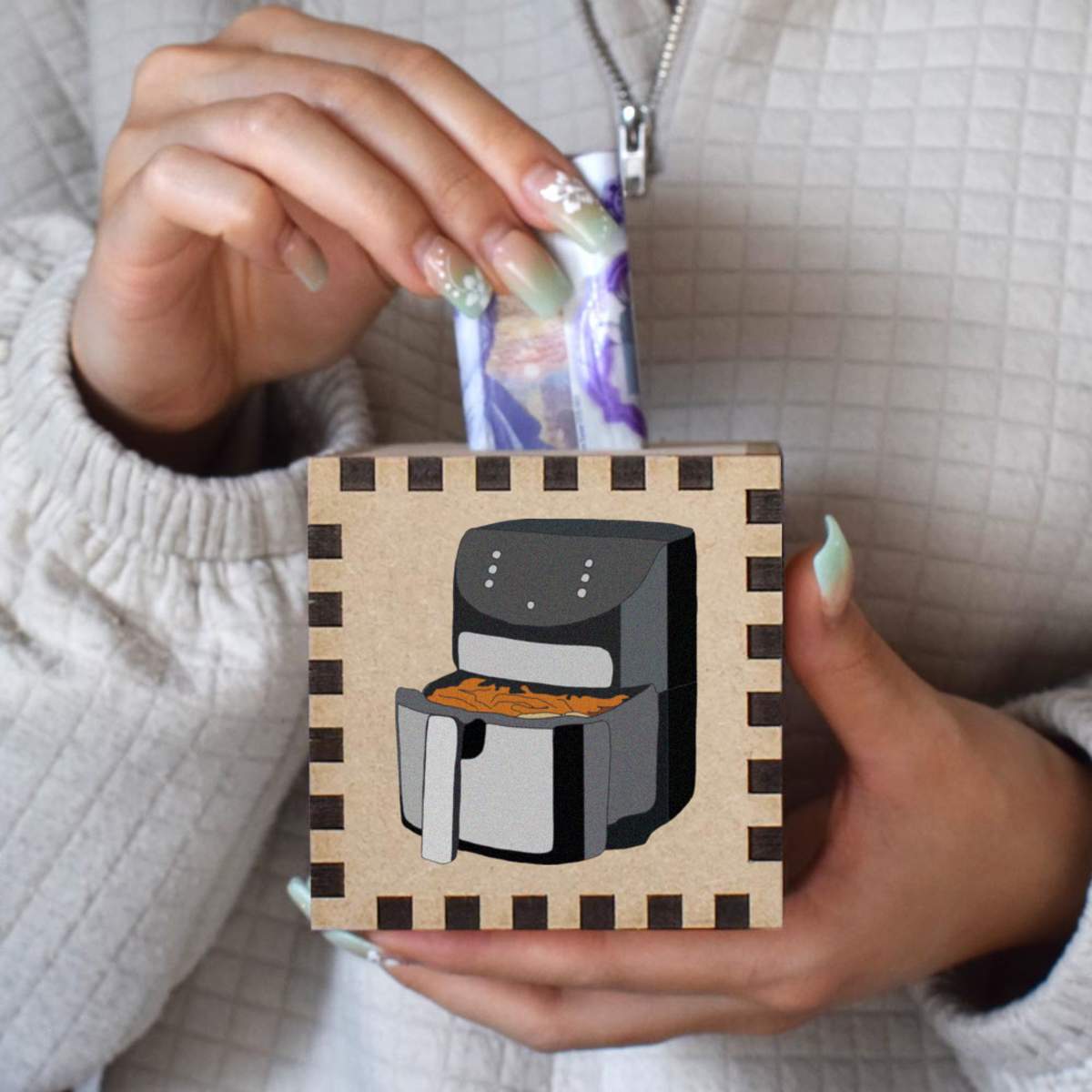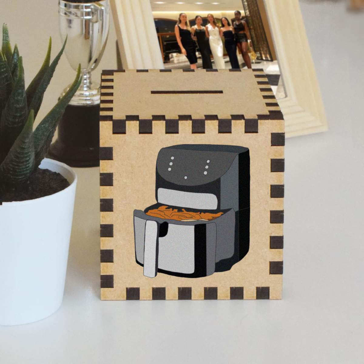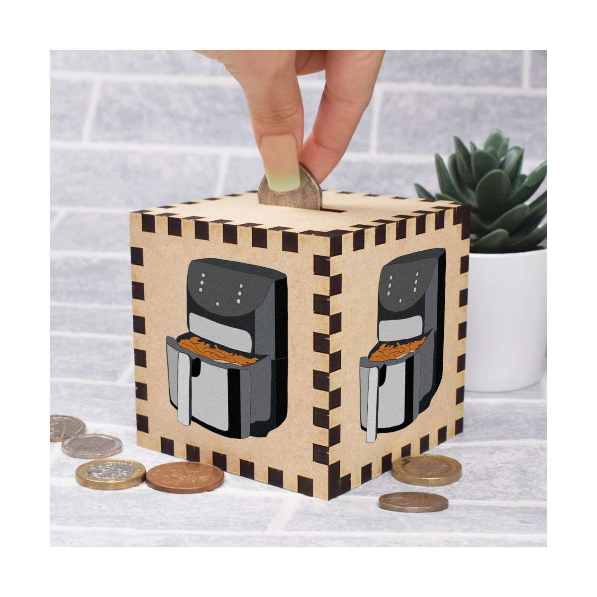 An 8.5cm wooden money box made out of the finest quality MDF and printed on all four sides with a unique design. The bottom is flat and the top has a slot for coins, the box itself is 85mm on each side, with a 35mm x 5mm coin slot, so please be sure it's suitable for you.