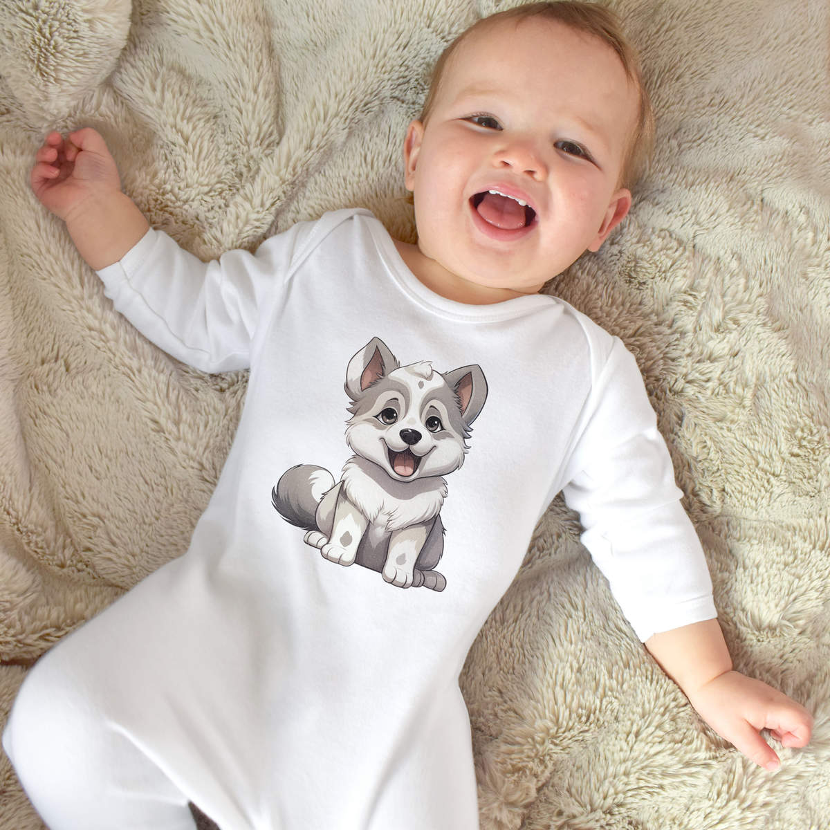 Little ones can sleep peacefully in this super soft romper sleepsuit. Our unisex jumpsuits are made from 100% cotton and are printed on the front with a unique design. Practical functions include popper fastenings for ease of changing and built-in feet.