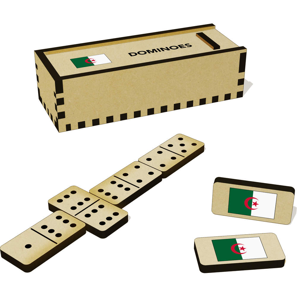 A full set of 28 MDF dominoes + an additional 6 blanks, complete with a slide top box to store them in.