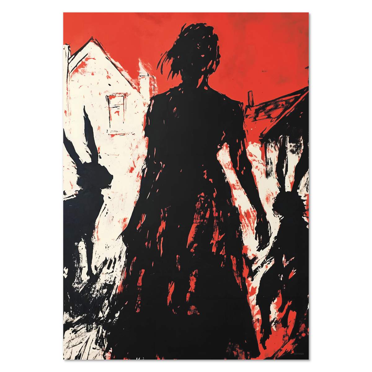 'harrowden, shadow hares, ammie thornwick, urban folklore, red and black art, gothic horror, northern gothic, haunted girl, folklore illustration, supernatural omen, eerie landscape, rabbit cryptid, spectral creatures, sootpunk, atmospheric art'