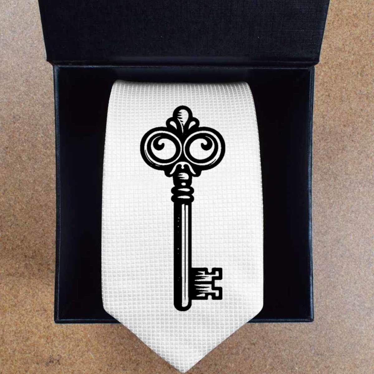 This stylish slim white tie is guaranteed to add class to any outfit. Printed on the front with a design from one of our talented designers, these ties are perfect for formal events, special occasions or making a statement at the office.