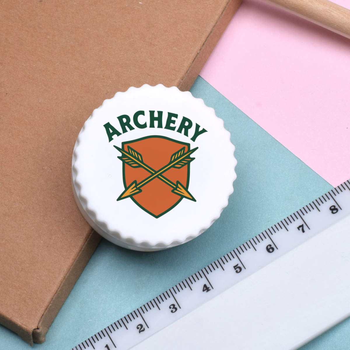 'A graphic symbol of two crossed arrows over a shield, with the word archery curved above the crest.'