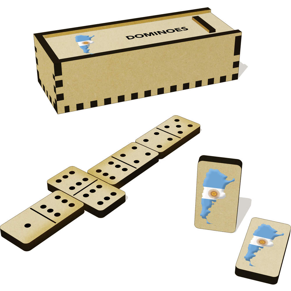 A full set of 28 MDF dominoes + an additional 6 blanks, complete with a slide top box to store them in.