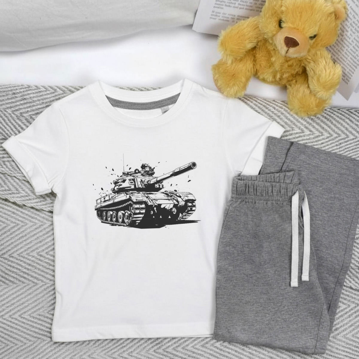 'Army tank' Kids Cotton Pyjama Set – Comfortable Children's Nightwear, Sleepwear and Loungewear - Unisex for Boys and Girls - Grey, 3-4 Years (KP00126466)