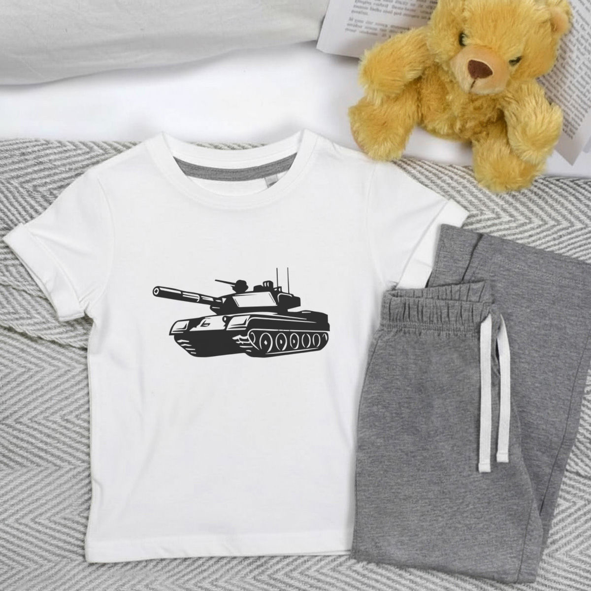 'Army War Tank' Kids Cotton Pyjama Set – Comfortable Children's Nightwear, Sleepwear and Loungewear - Unisex for Boys and Girls – Grey (KP047624)