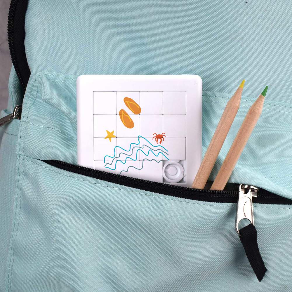 - Pocket sized puzzle with sliding square pieces