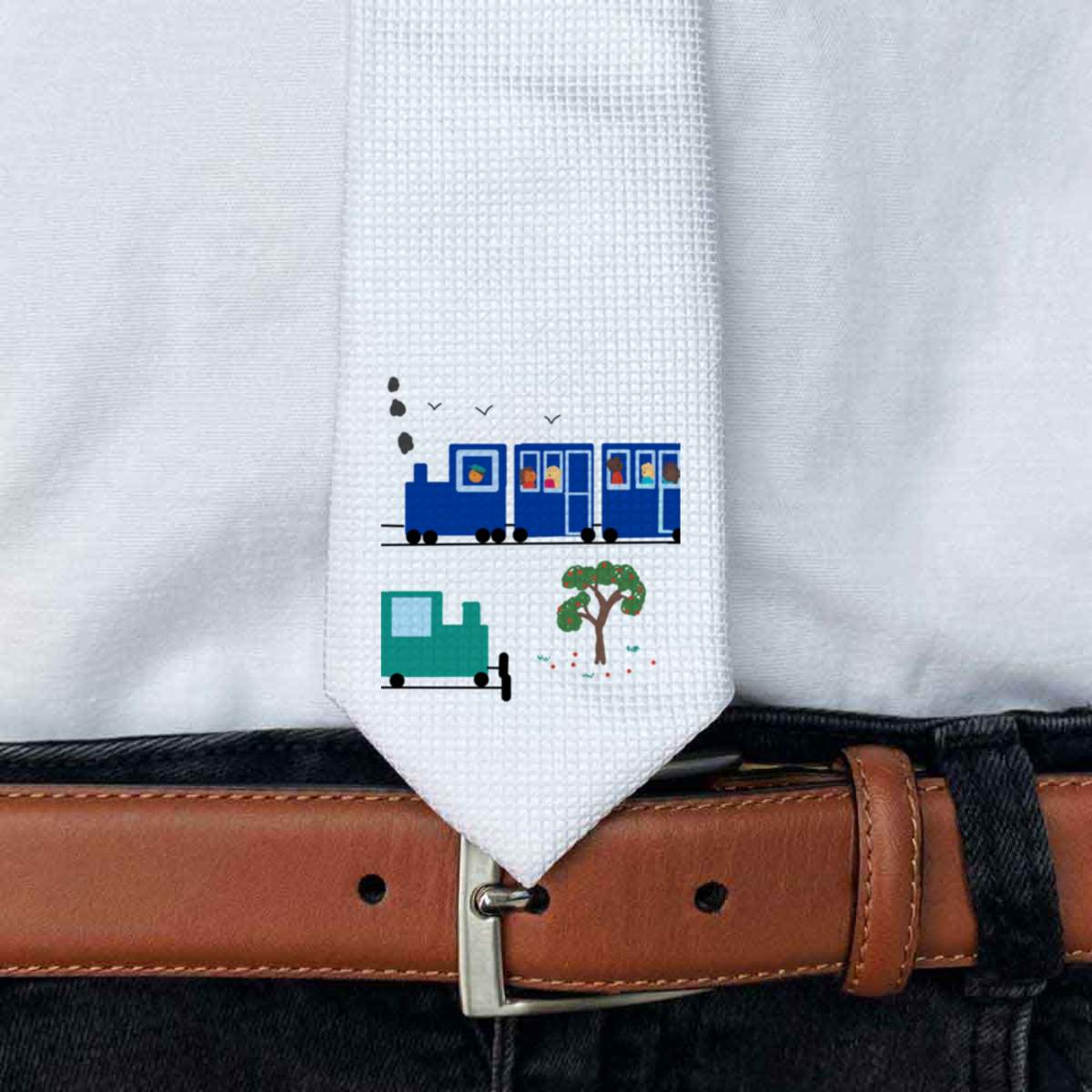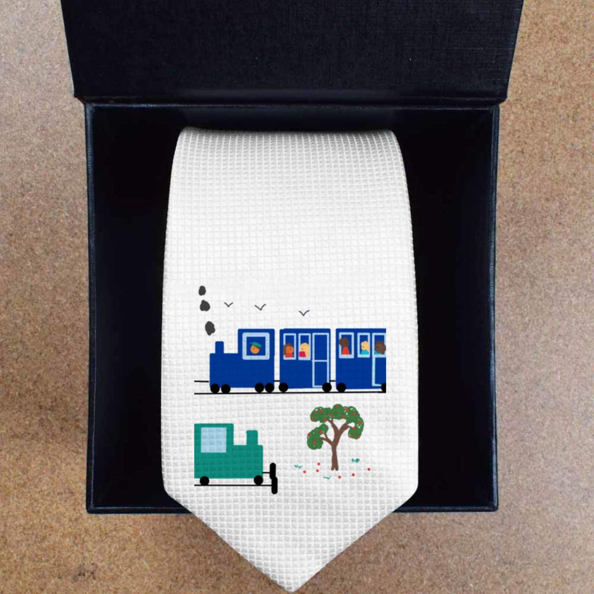This stylish slim white tie is guaranteed to add class to any outfit. Printed on the front with a design from one of our talented designers, these ties are perfect for formal events, special occasions or making a statement at the office.