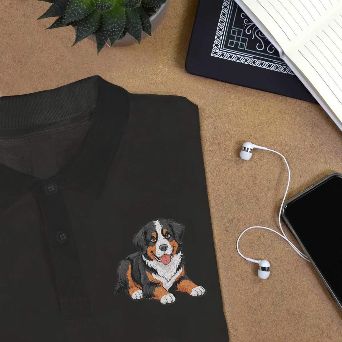'A cartoon-style illustration of a Bernese Mountain Dog puppy with a happy expression. The puppy has a black and white coat with orange patches, and its tongue is sticking out. Its eyes are large and expressive, and it has a friendly and playful look. The dog has its front paws tucked under its body and its tail curled around its feet.'