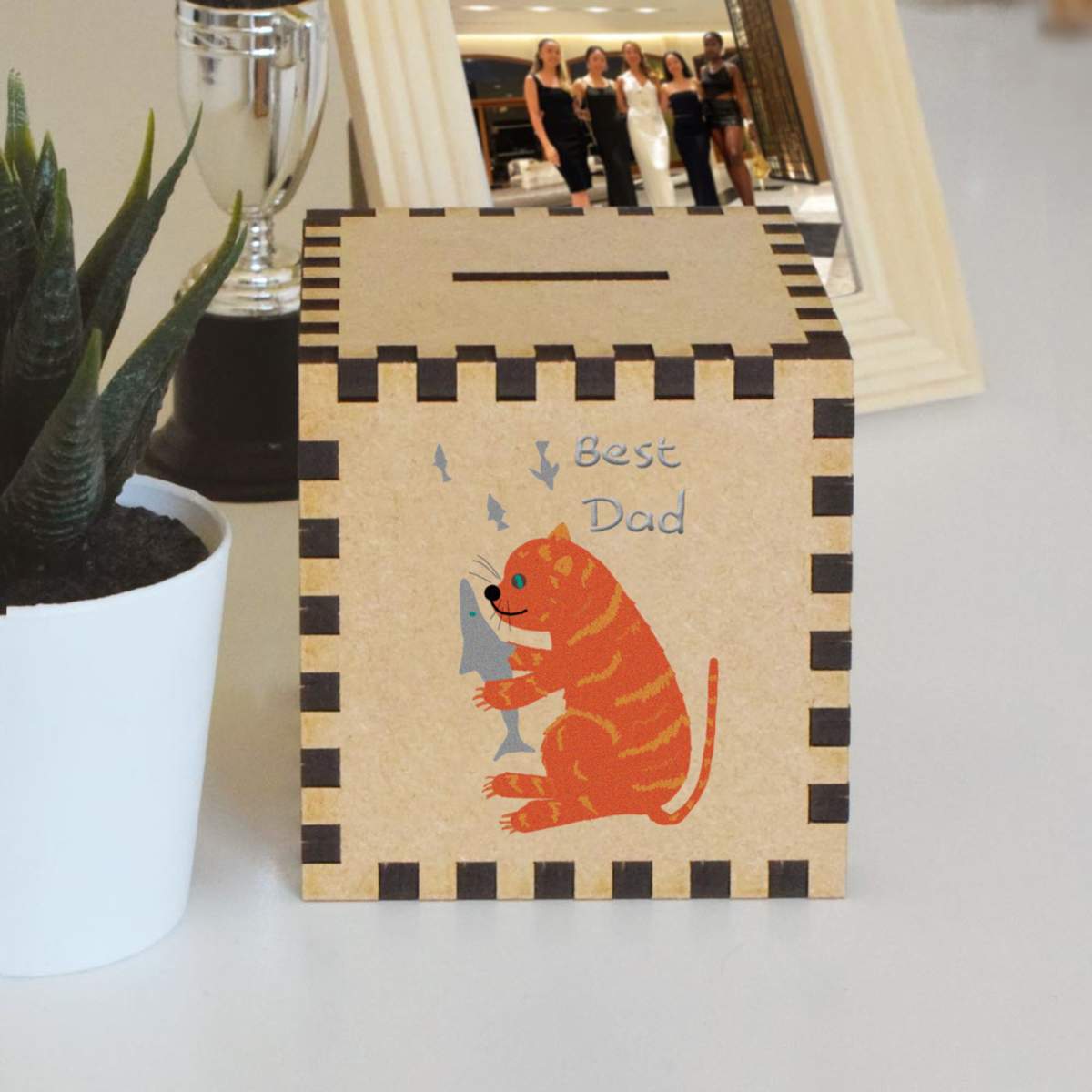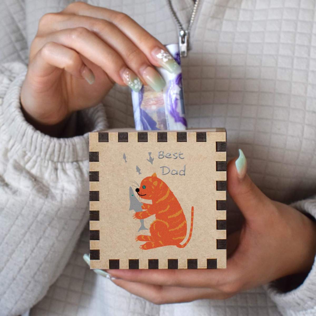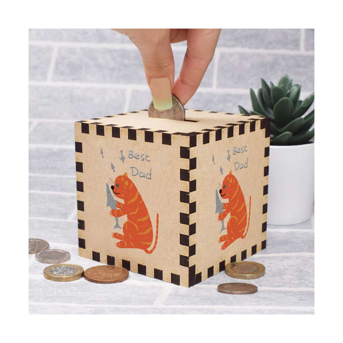 An 8.5cm wooden money box made out of the finest quality MDF and printed on all four sides with a unique design. The bottom is flat and the top has a slot for coins, the box itself is 85mm on each side, with a 35mm x 5mm coin slot, so please be sure it's suitable for you.