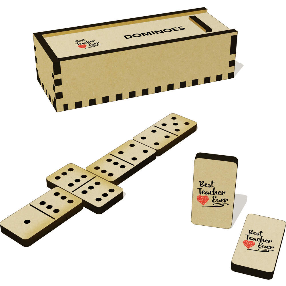 The dominoes are printed on one side with the playing face and the other with a unique design. The slide top box has the word 'Dominoes' printed on the lid along with the same design that's on the dominoes themselves.