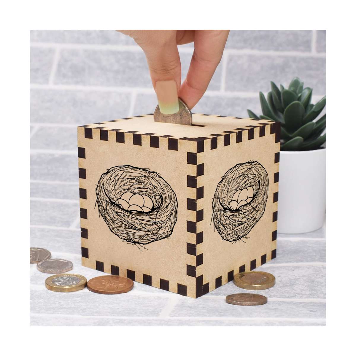 • 8.5cm cube wooden money box