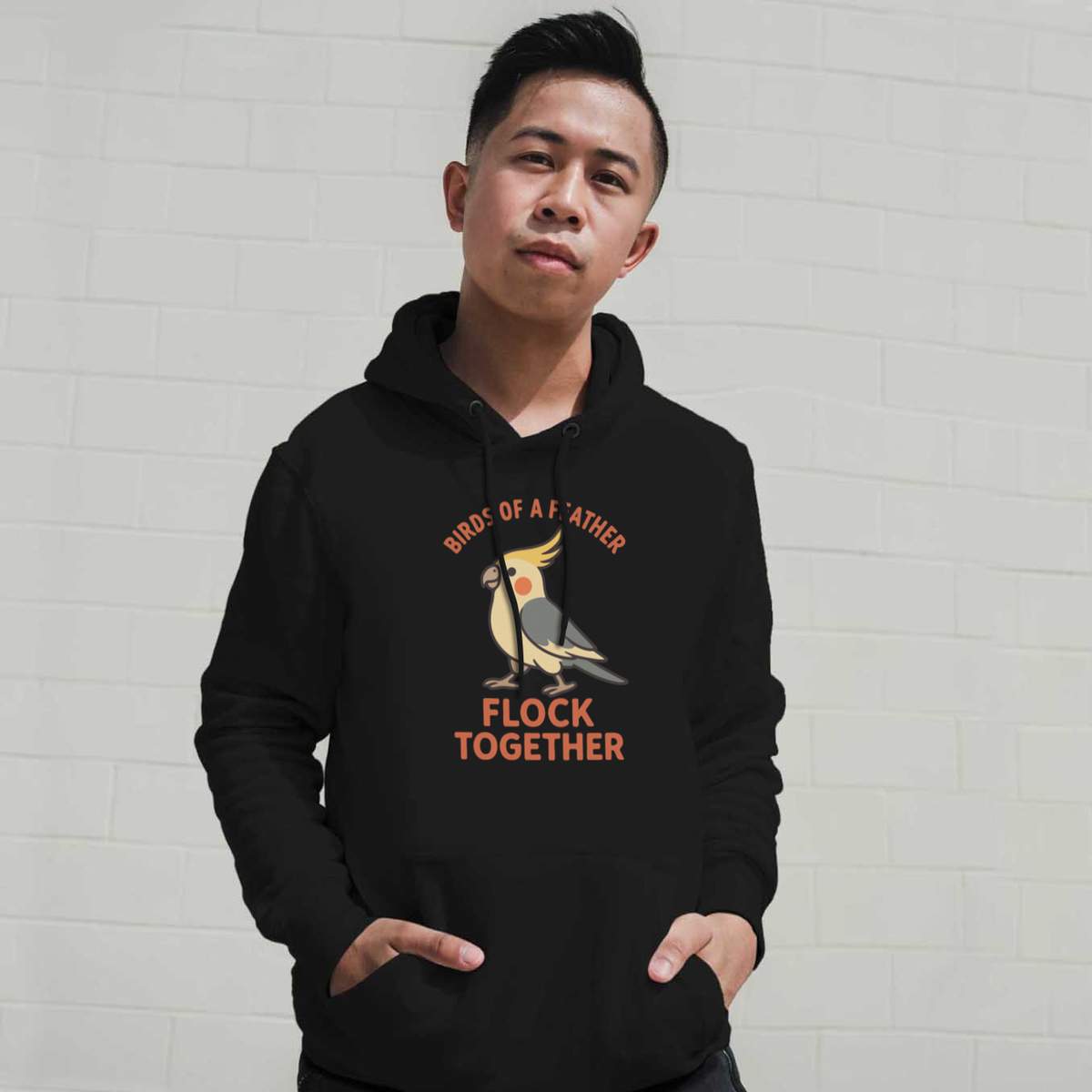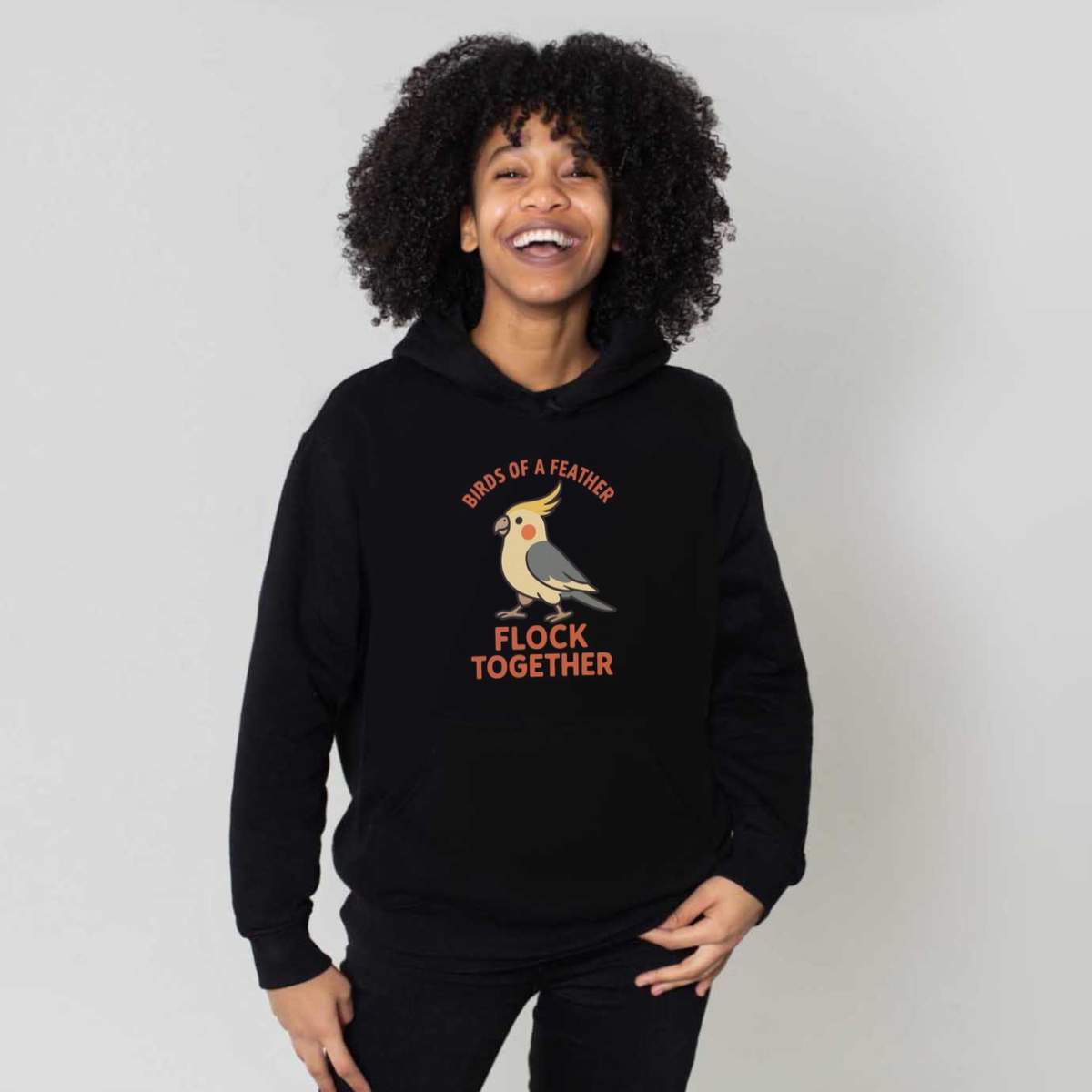 'The phrase 'birds of a feather flock together' with a cute cockatiel.'