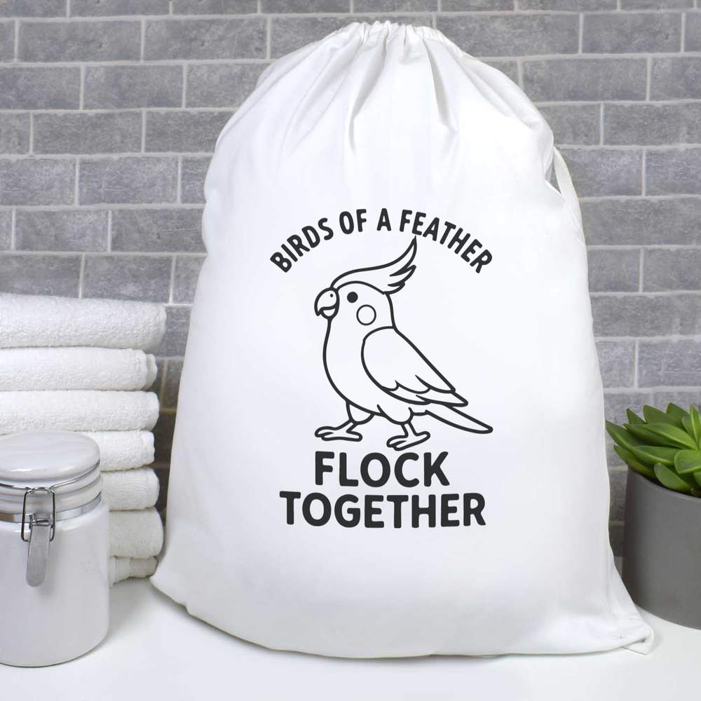 'The phrase 'birds of a feather flock together' with a cute cockatiel.'