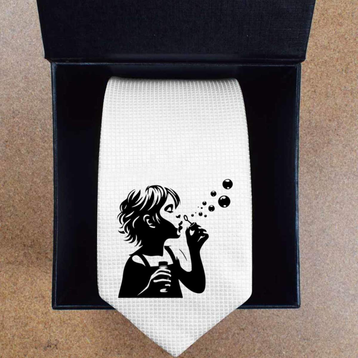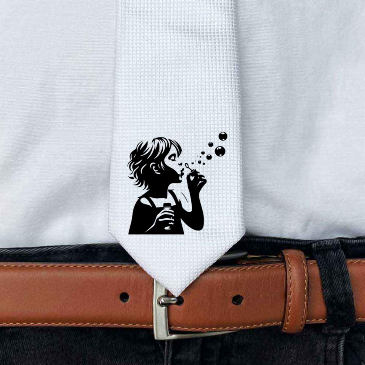 This stylish slim white tie is guaranteed to add class to any outfit. Printed on the front with a design from one of our talented designers, these ties are perfect for formal events, special occasions or making a statement at the office.
