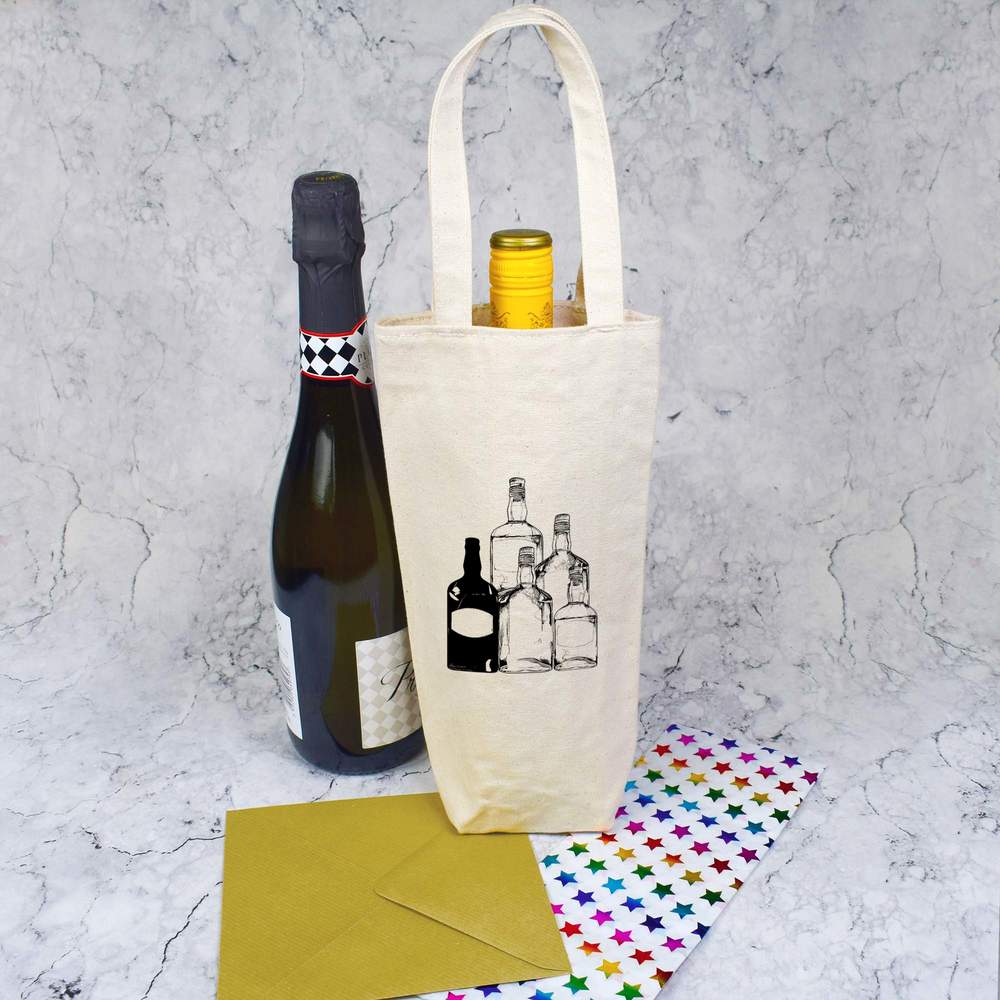 Give a gift in style with this wonderful wine bottle bag. Printed one side with a unique design, this bag oozes with class. Each one is made from thick natural canvas and its high quality finish means it can be used again and again; perfect for picnics and adventures where a bottle of the finest wine is required. This bottle bag can comfortably carry a single standard wine or champagne bottle, up to 1.5 litres, but please check the bag dimensions are suitable before purchasing.