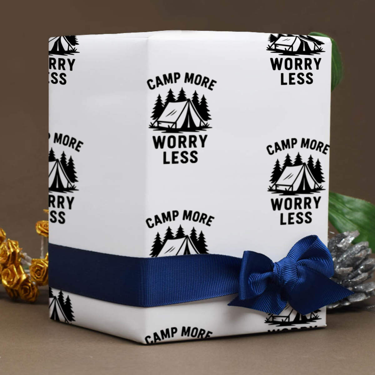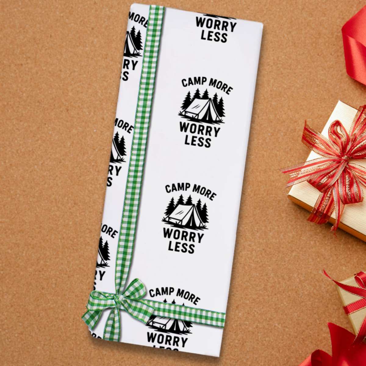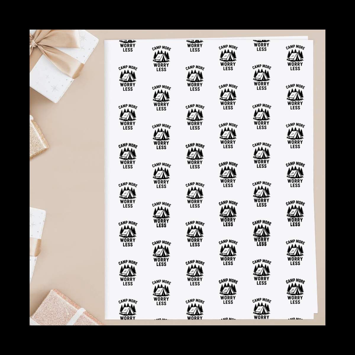 'An inspiring design featuring a tent and trees, encouraging more outdoor adventures and less worrying about daily life'