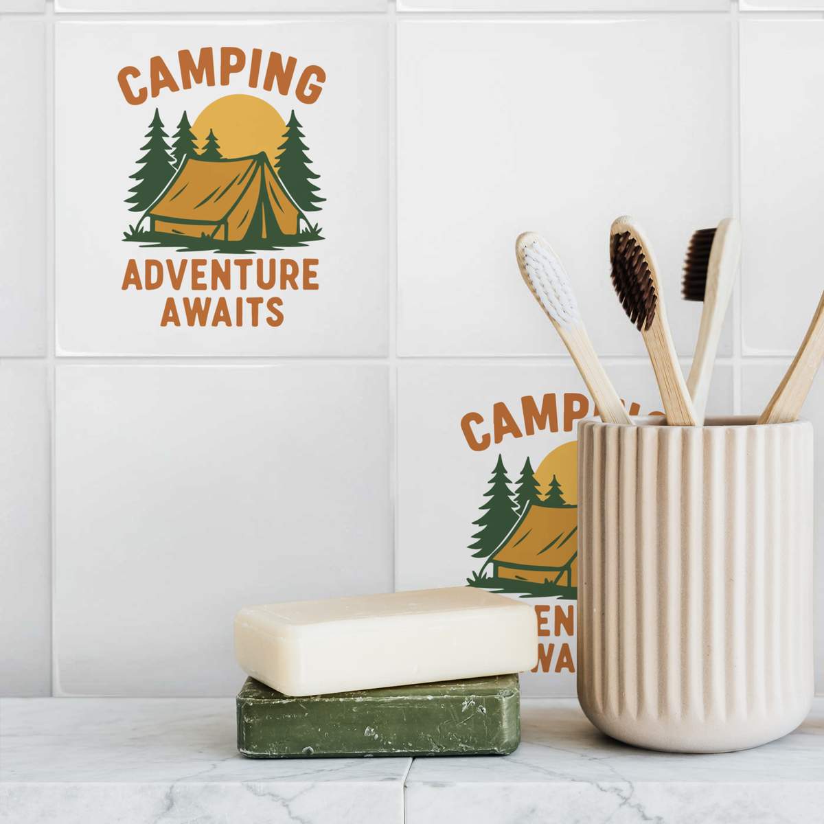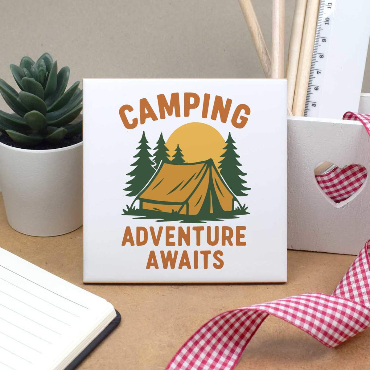 'A captivating design featuring a tent and natural scenery, perfect for anyone who believes adventure awaits in the great outdoors'