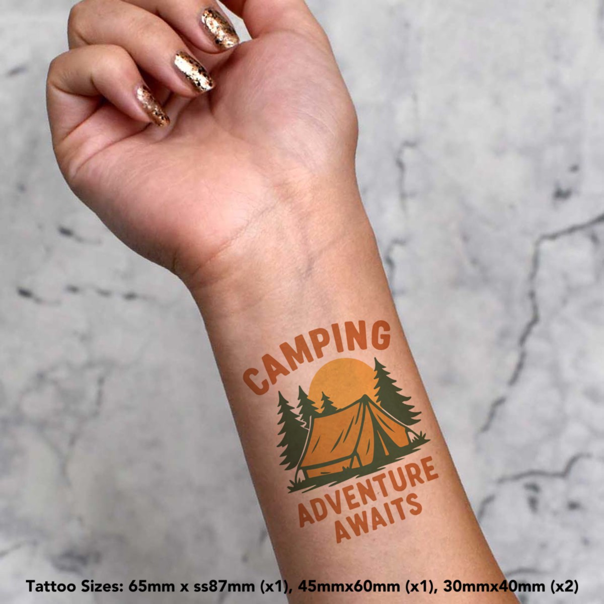 'Camping Adventure Awaits' Temporary Tattoos - Water Resistant, Skin-Safe, Non-Toxic Transfers (TO055490)