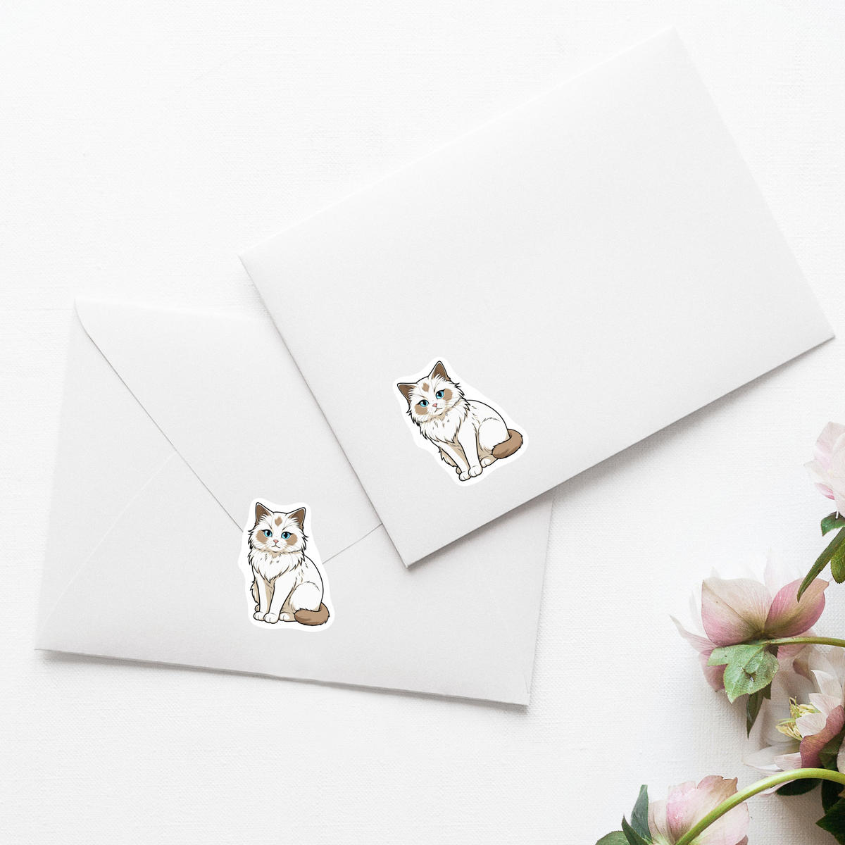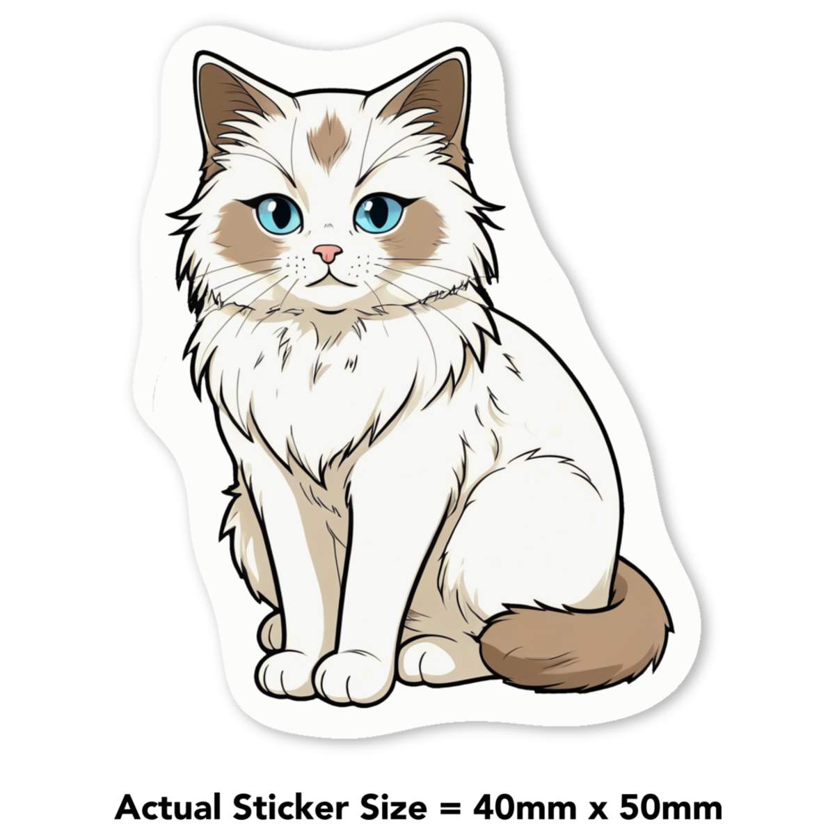'How to draw a Ragdoll cat with blue eyes, sitting on a white background. The cat has a fluffy white coat with light brown patches on its face, chest, and tail. Its eyes are large and expressive, with a pink nose and whiskers. Its ears are perked up and its mouth is slightly open, giving it a curious expression. The drawing is done in a simple, cartoon-like style with clean lines and shading.'