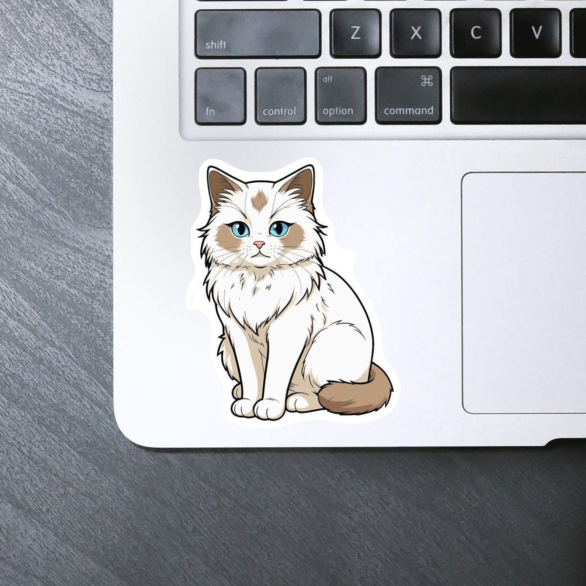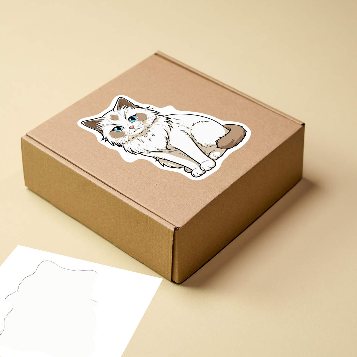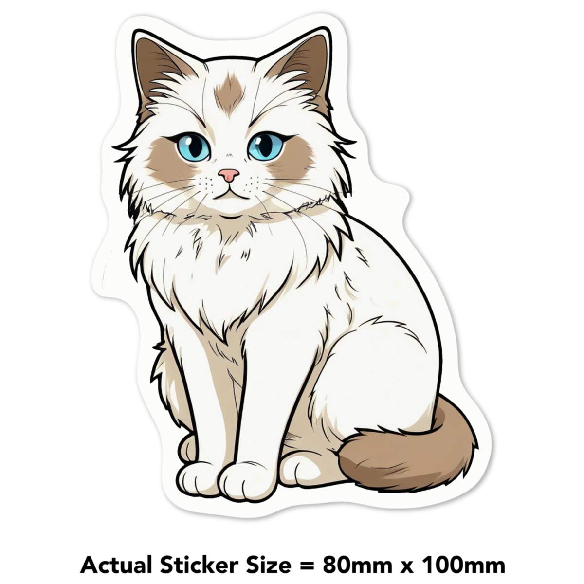 'How to draw a Ragdoll cat with blue eyes, sitting on a white background. The cat has a fluffy white coat with light brown patches on its face, chest, and tail. Its eyes are large and expressive, with a pink nose and whiskers. Its ears are perked up and its mouth is slightly open, giving it a curious expression. The drawing is done in a simple, cartoon-like style with clean lines and shading.'