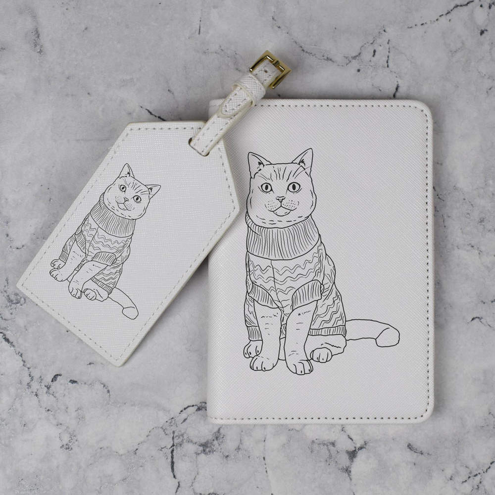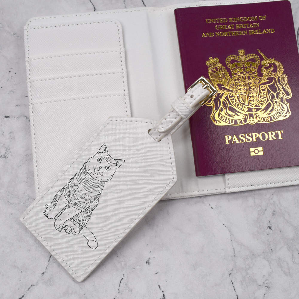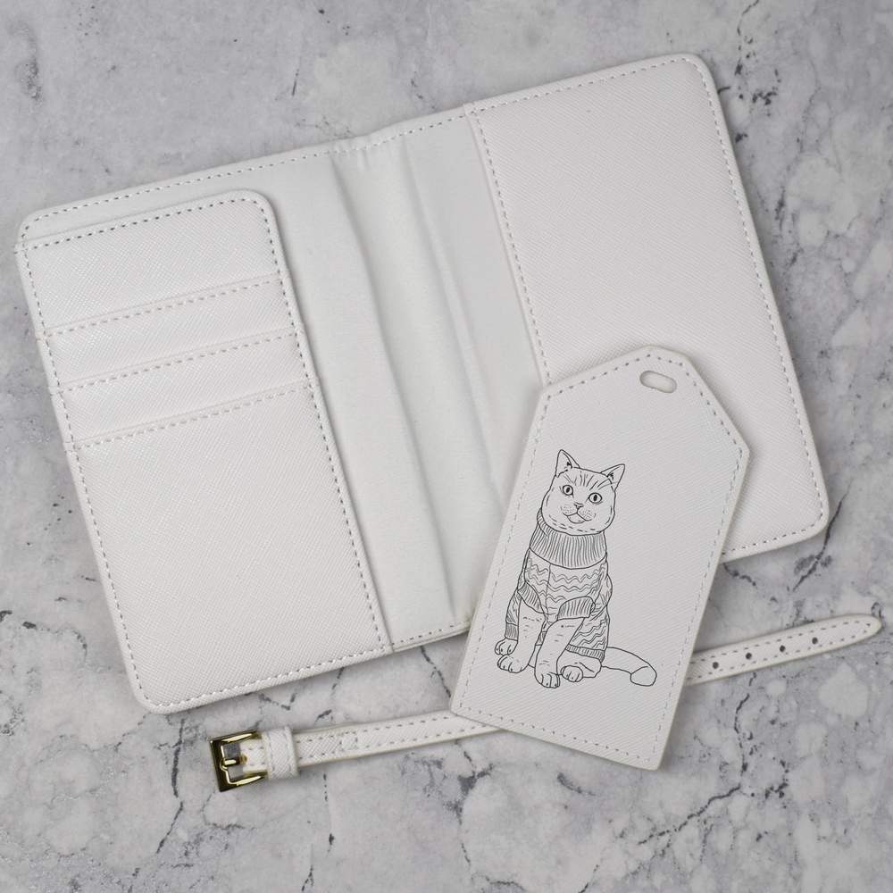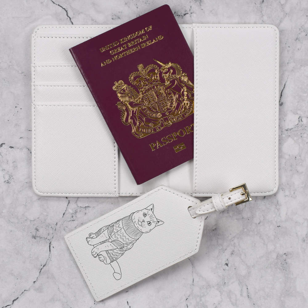A luxury travel set for holiday makers and jet setters! This premium duo consists of a passport cover and matching luggage tag; both made from white, leather-look PU and printed with a unique design.