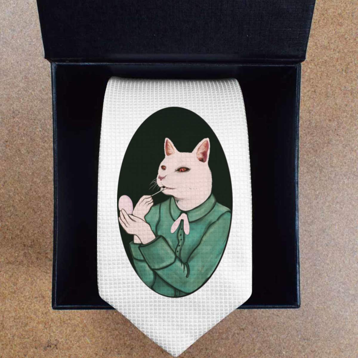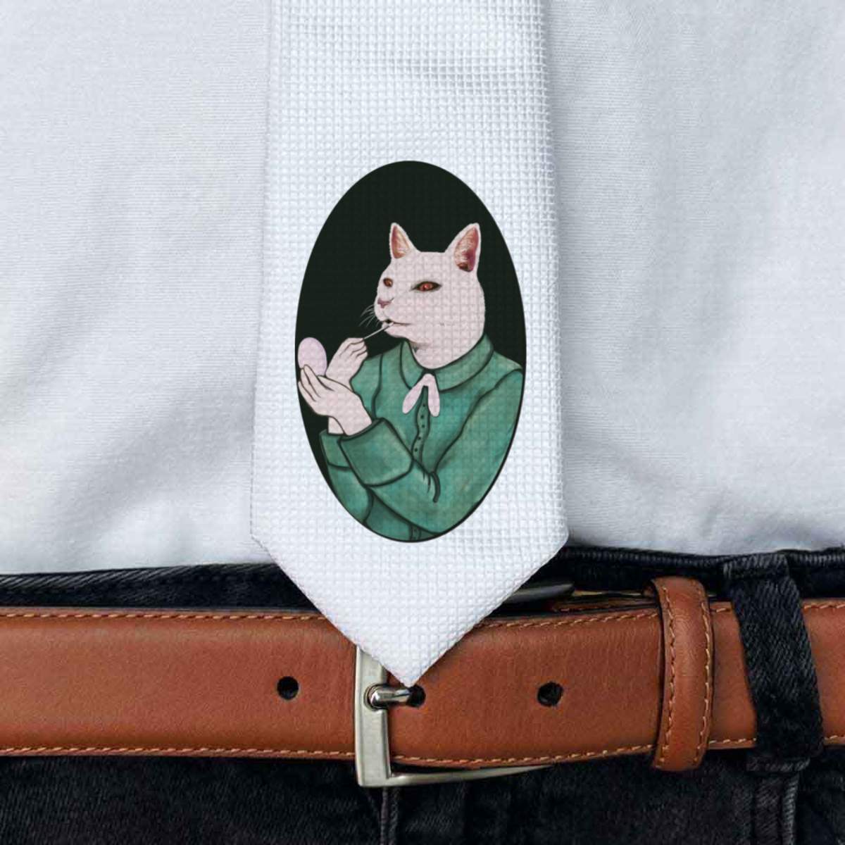 'Cat Wearing Lip Gloss' White Tie / Necktie with Gift Box (AT00004856)