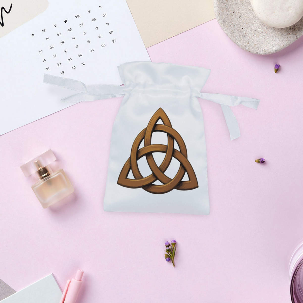 'An ancient Celtic spiritual symbol, the Triquetra triple knot appears carved from polished brown wood.'