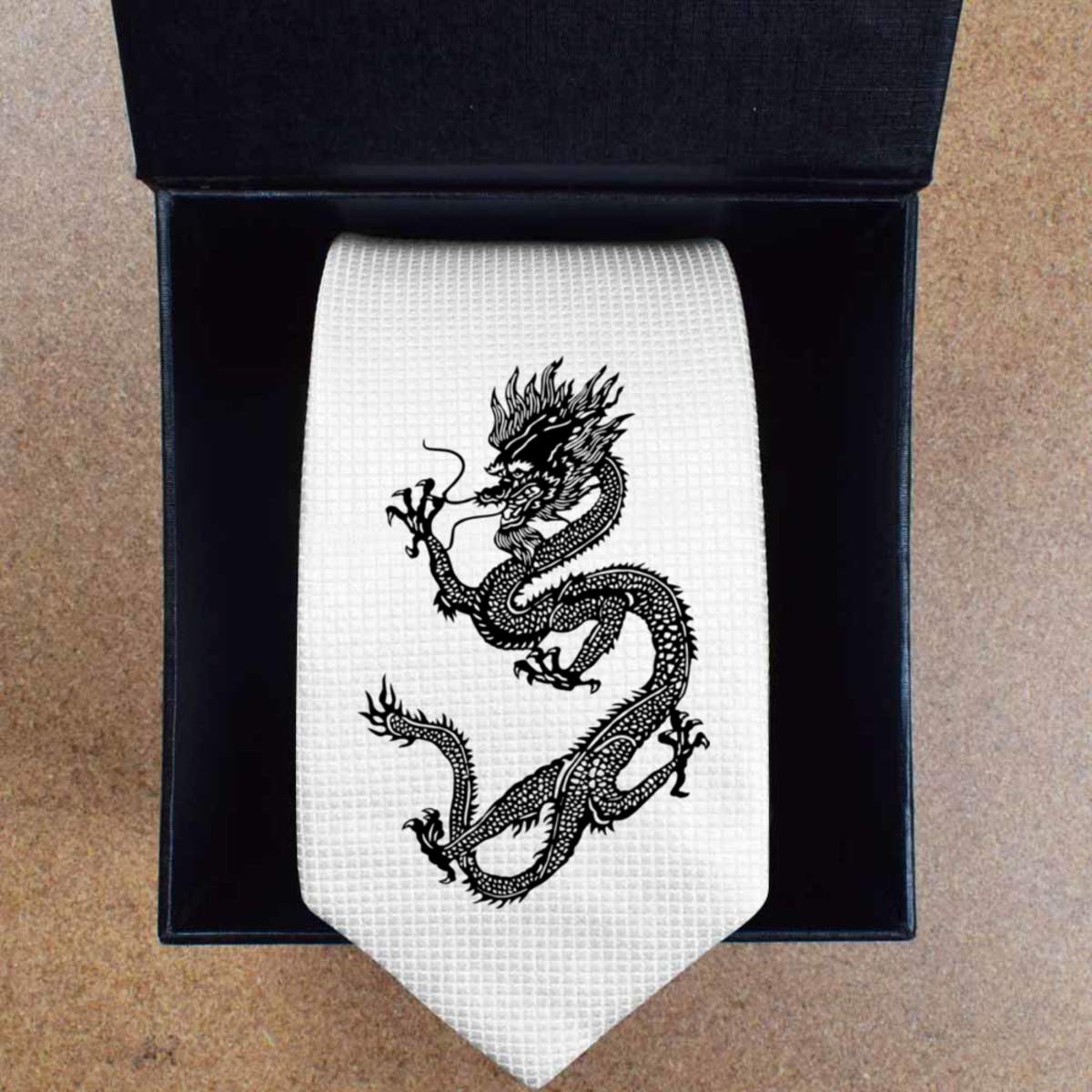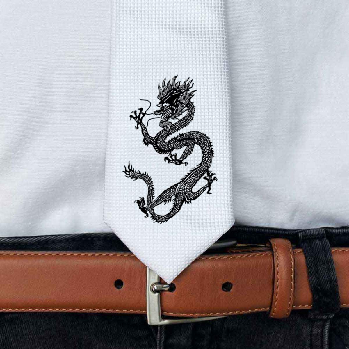 This stylish slim white tie is guaranteed to add class to any outfit. Printed on the front with a design from one of our talented designers, these ties are perfect for formal events, special occasions or making a statement at the office.