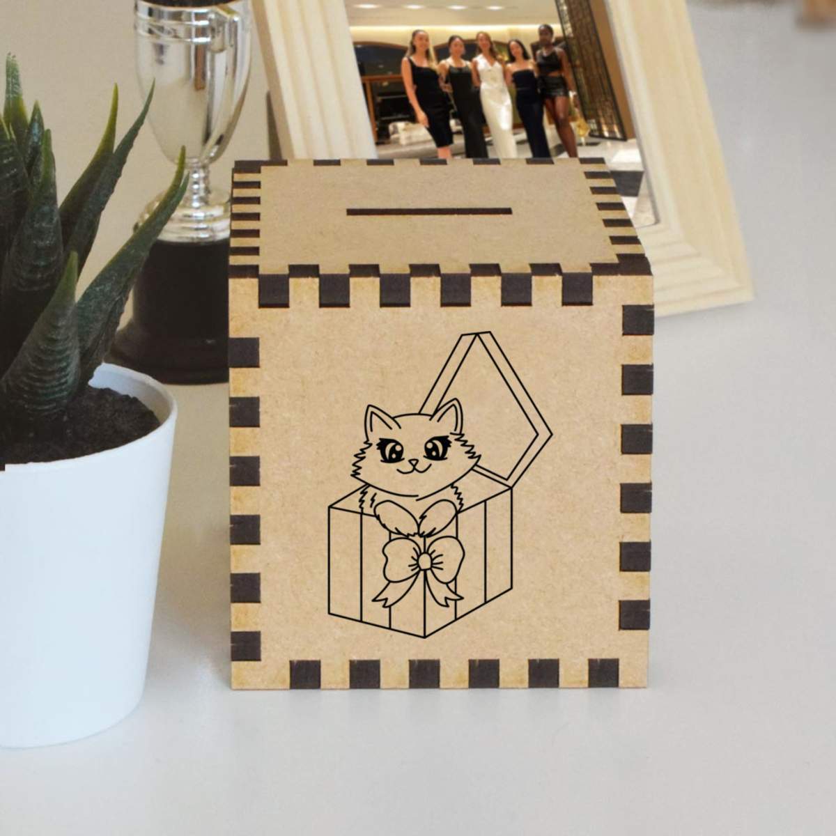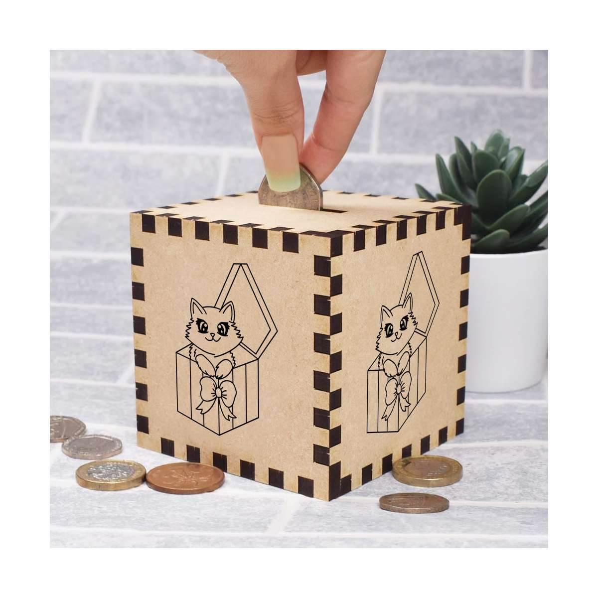 An 8.5cm wooden money box made out of the finest quality MDF and printed on all four sides with a unique design. The bottom is flat and the top has a slot for coins, the box itself is 85mm on each side, with a 35mm x 5mm coin slot, so please be sure it's suitable for you.