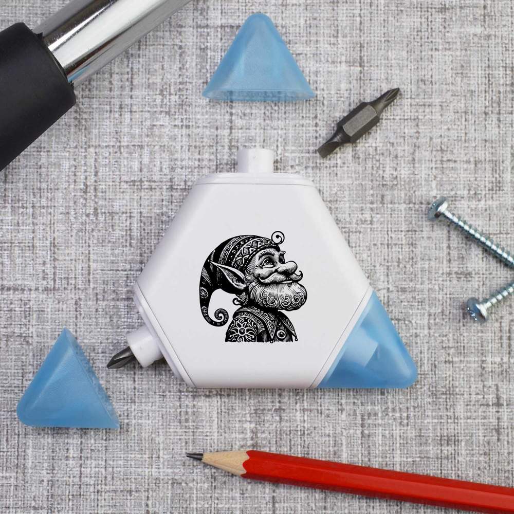 Our triangular compact multi tool is printed on one side with a unique design, making it a great gift for DIY lovers. This 3-in-1 tool set contains a tape measure and 2 different screwdriver attachments and each corner has a snap shut lid. One corner reveals a 1 meter tape measure, while the others hide two reversible screwdriver attachments, one larger and one smaller, both of which have a cross head on one end and a flat head on the other.