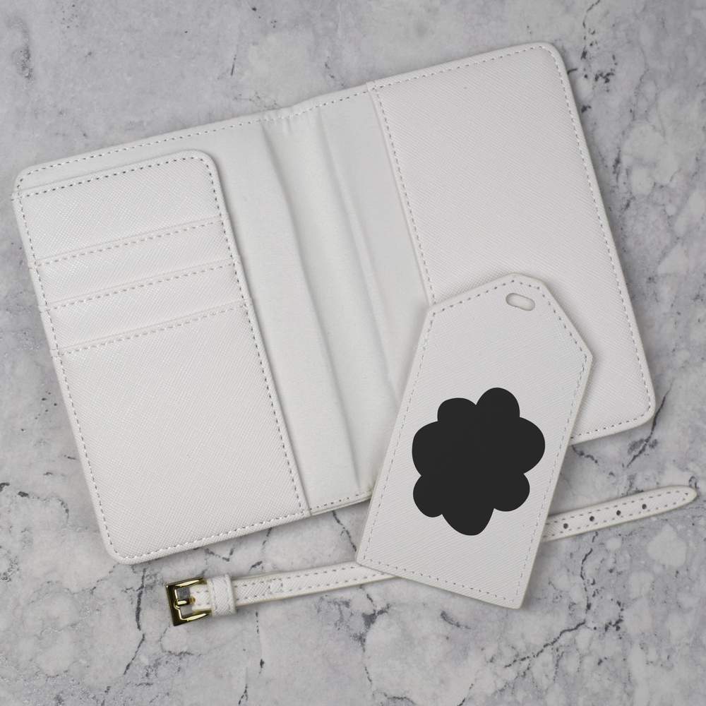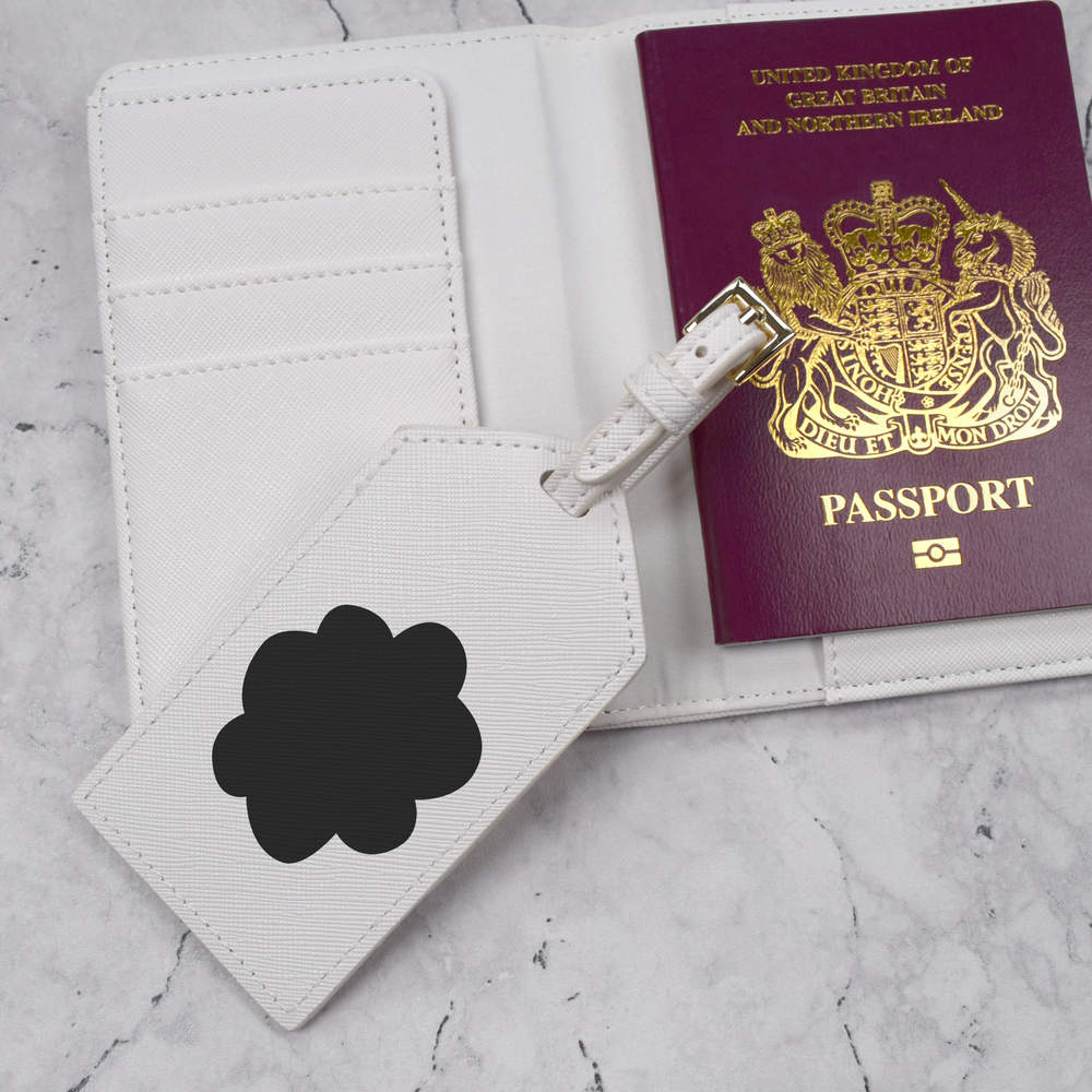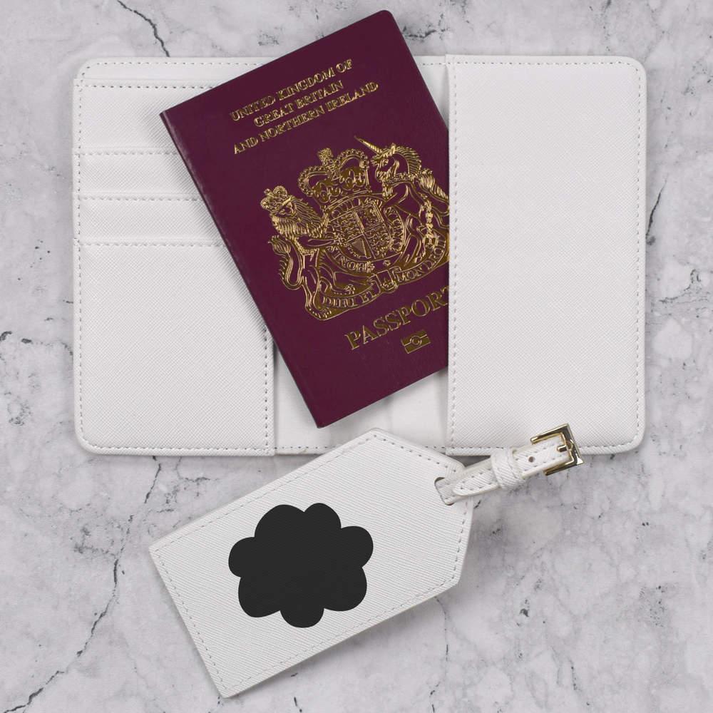 A luxury travel set for holiday makers and jet setters! This premium duo consists of a passport cover and matching luggage tag; both made from white, leather-look PU and printed with a unique design.