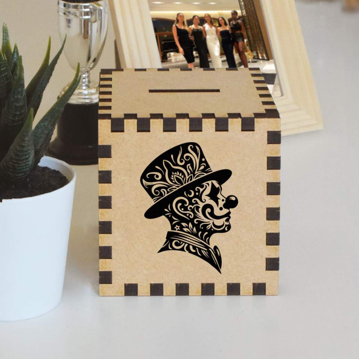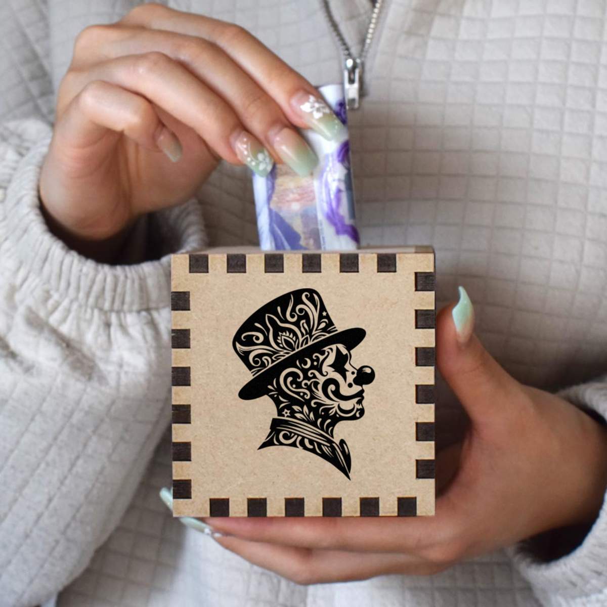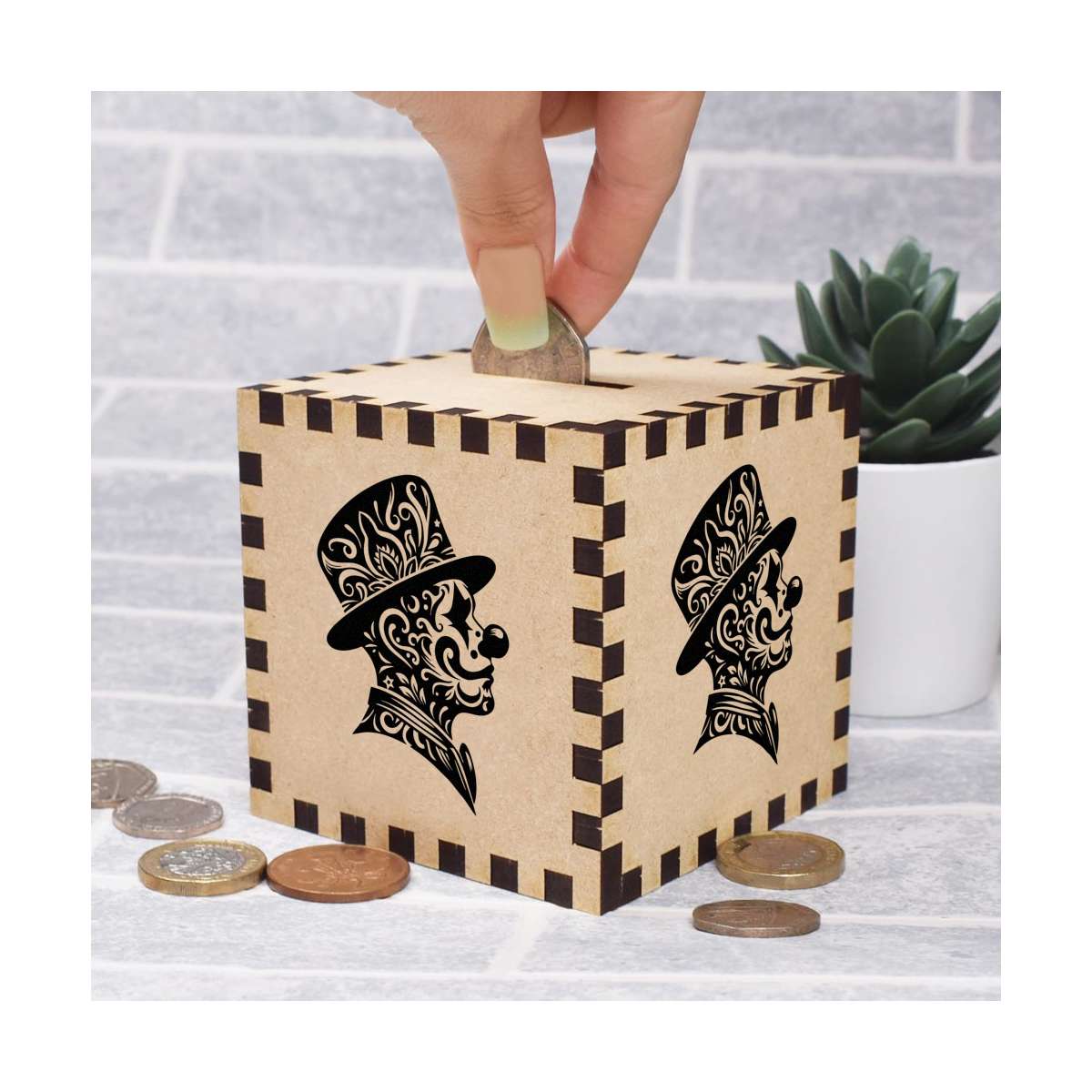 An 8.5cm wooden money box made out of the finest quality MDF and printed on all four sides with a unique design. The bottom is flat and the top has a slot for coins, the box itself is 85mm on each side, with a 35mm x 5mm coin slot, so please be sure it's suitable for you.