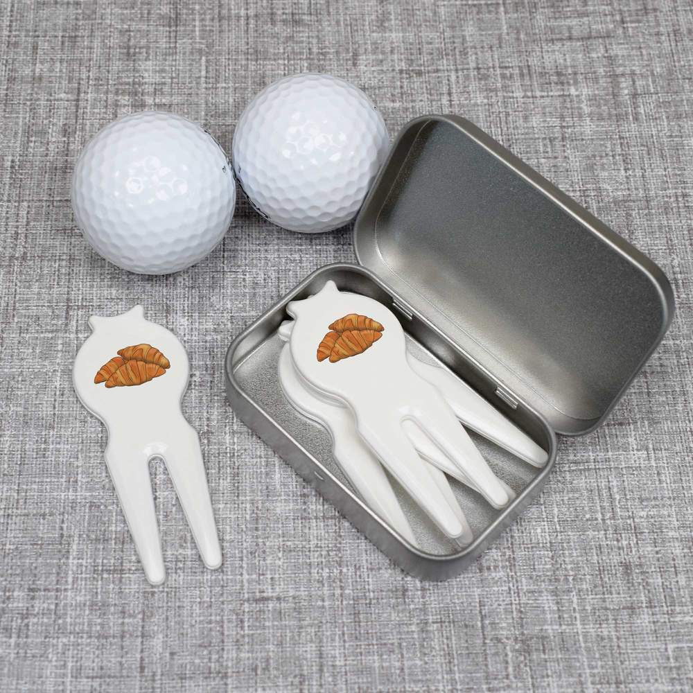 A fantastic gift for any golfer! This set includes 4 plastic divot tools / pitch forks, each printed on one side with a unique design. All 4 forks come in a small tin with a matching design printed on the lid.
