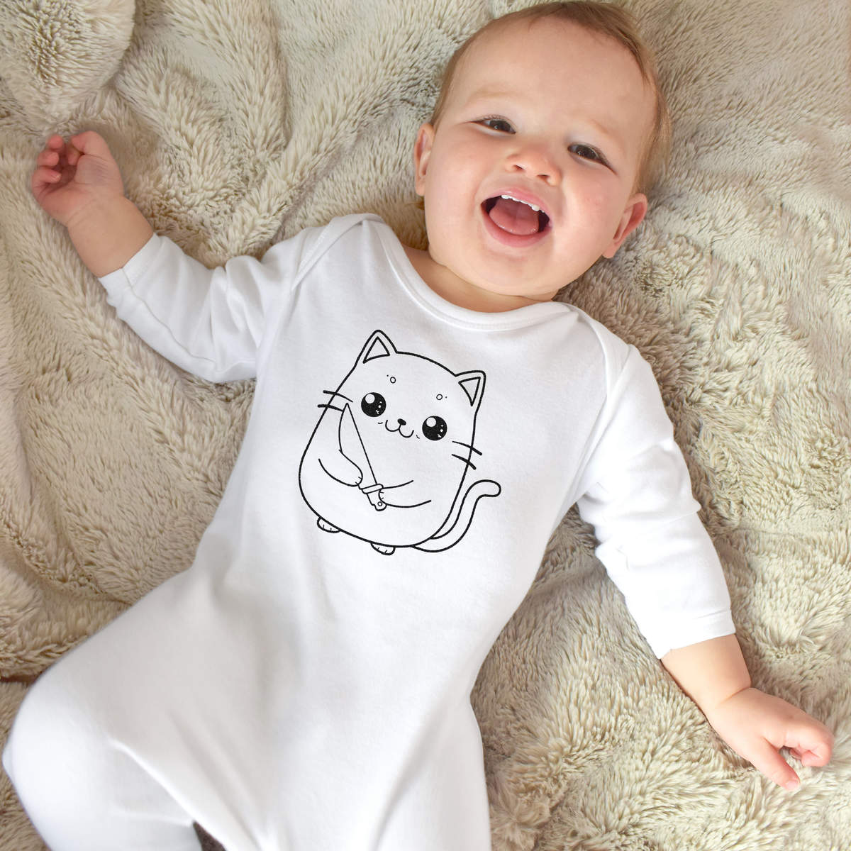 Little ones can sleep peacefully in this super soft romper sleepsuit. Our unisex jumpsuits are made from 100% cotton and are printed on the front with a unique design. Practical functions include popper fastenings for ease of changing and built-in feet.