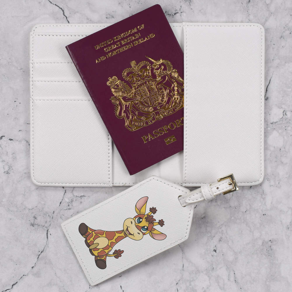 A luxury travel set for holiday makers and jet setters! This premium duo consists of a passport cover and matching luggage tag; both made from white, leather-look PU and printed with a unique design.