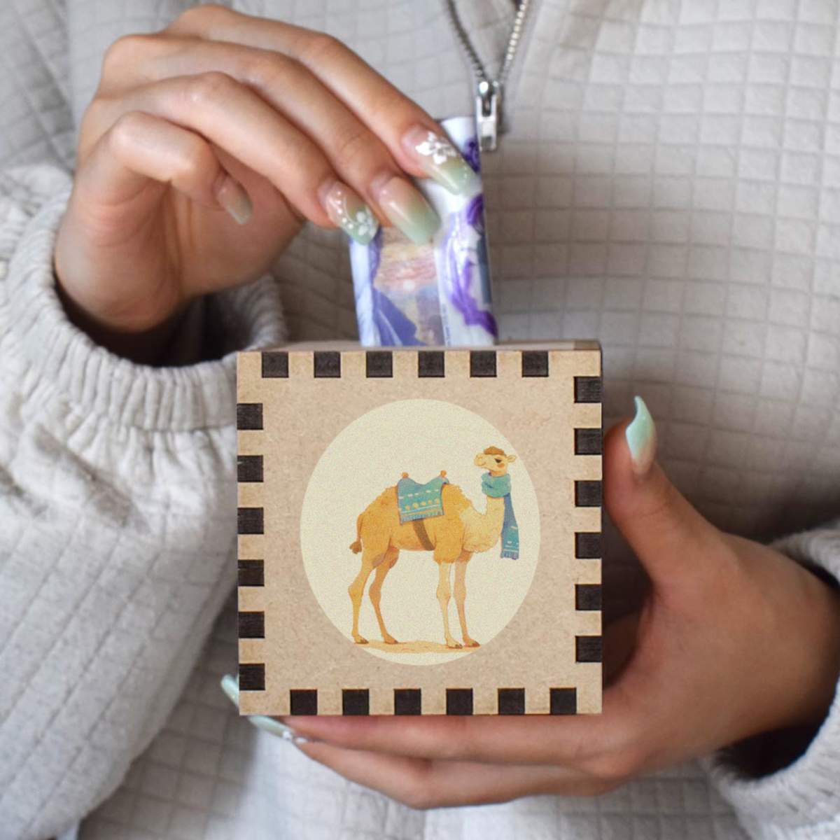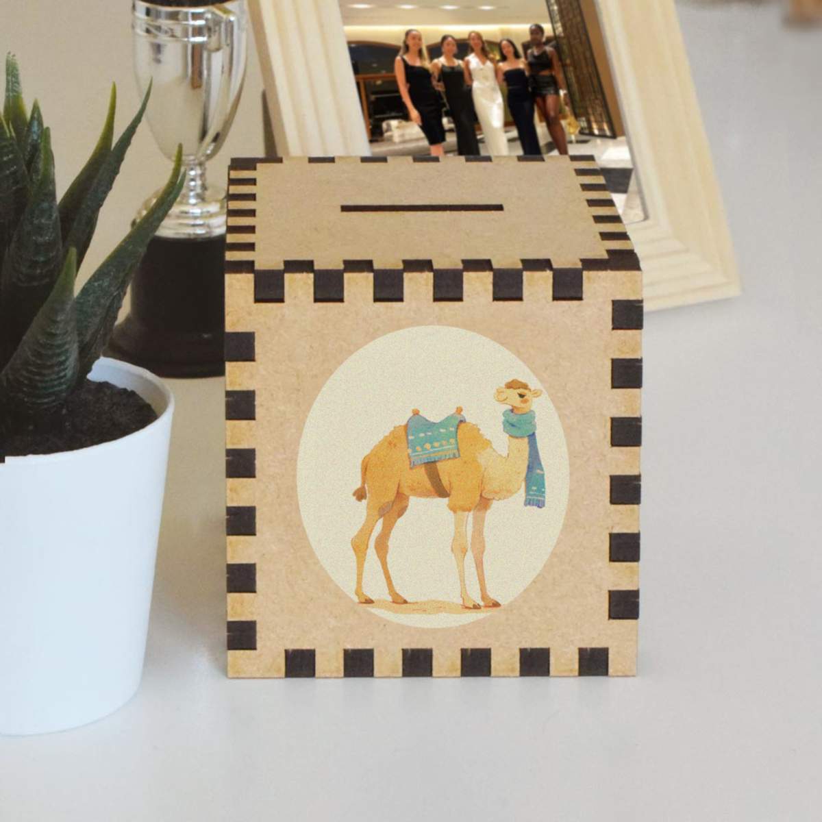 An 8.5cm wooden money box made out of the finest quality MDF and printed on all four sides with a unique design. The bottom is flat and the top has a slot for coins, the box itself is 85mm on each side, with a 35mm x 5mm coin slot, so please be sure it's suitable for you.